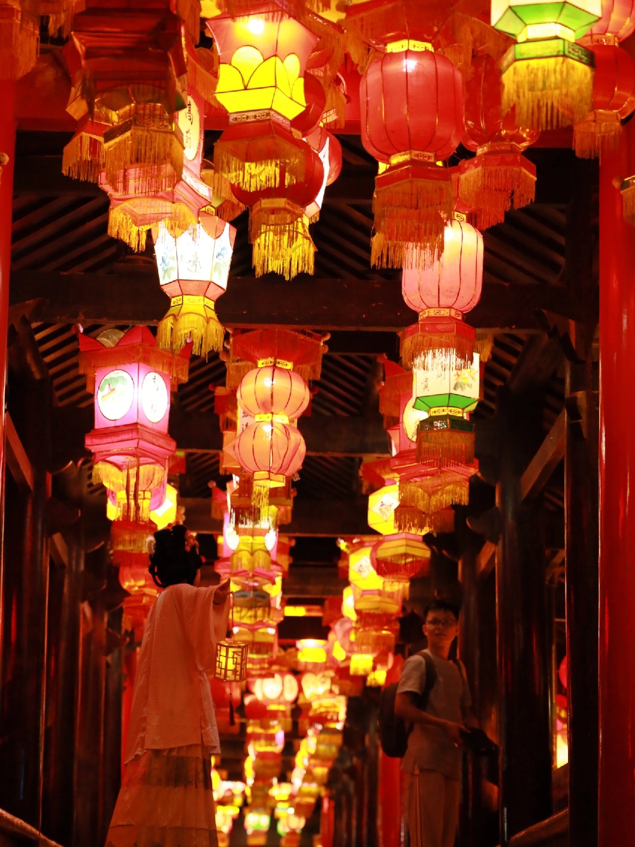 At nightfall, the ten thousand lanterns brighten up the night, creating an atmosphere of peace and prosperity. It's a display of the grand spectacle of a traditional Mid-Autumn lantern festival, making people linger and never wanting to leave.