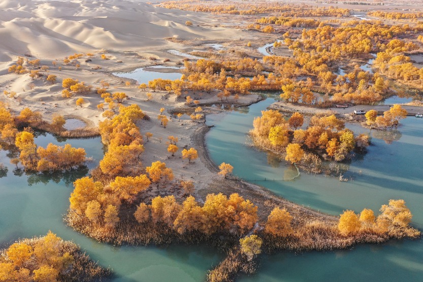 They are drenched in rich autumn colours, creating a fascinating landscape, including the golden sea of forests - the "living fossil" poplar forest.