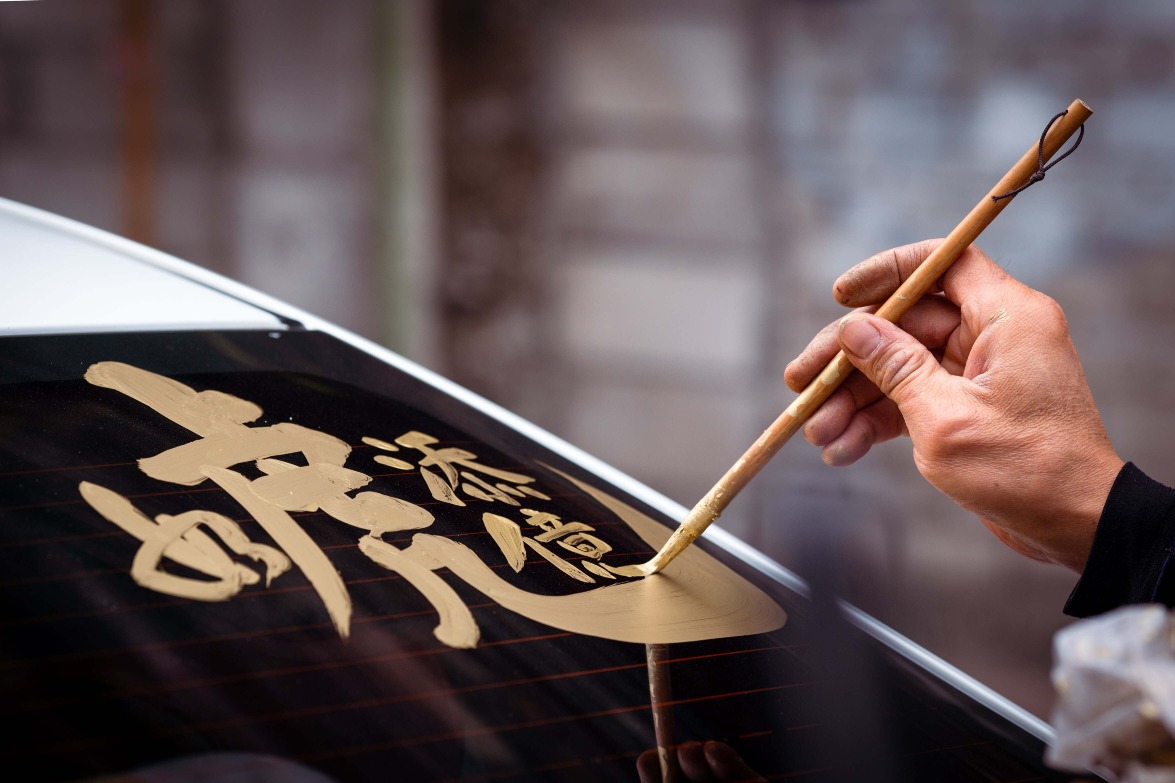 Car owners from different regions drive their beloved cars to Kuaizi Road, hoping to get Fai Chun written by masters on their car bodies for good fortune.