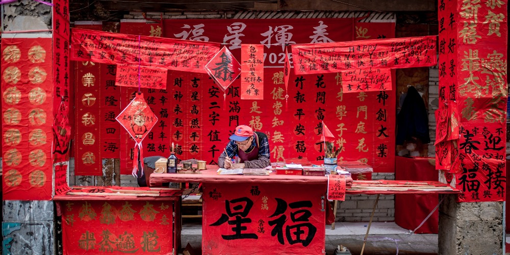 With a sheet of red paper and a swipe of ink, couplets and spring couplets are created in the blink of an eye.
