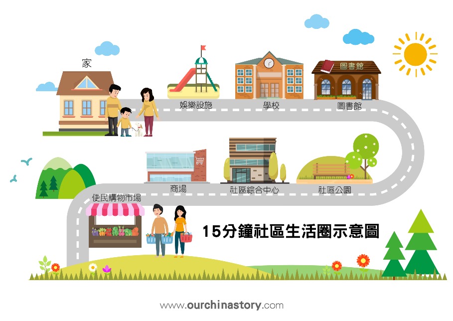 所謂「15分鐘社區生活圈」,是以居住區為原點,步行15分鐘所及範圍為半徑,形成一個滿足人們居住的輻射區域圈。也就是說,居民在居住區向東南西北任何一方步行15分鐘的範圍內,就能享有日常基本的生活購物、休閒健身、學習乃至醫療等配套服務設施,不用花時間坐車。