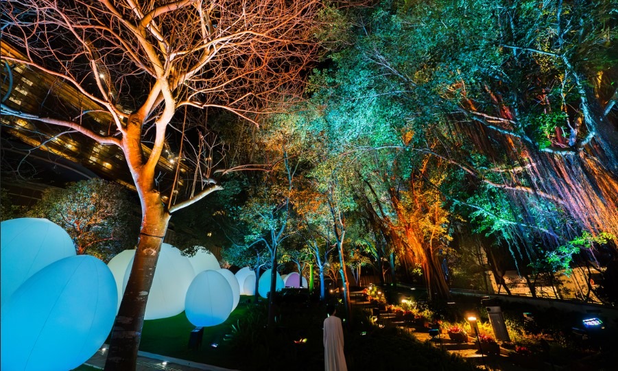 彩蛋旁邊的樹木,也安裝有產生不同色彩和音樂的裝置,仿佛樹木也來感受這熱鬧的氛圍。身在其中,讓人沉浸式感受光影幻變,眼界大開。