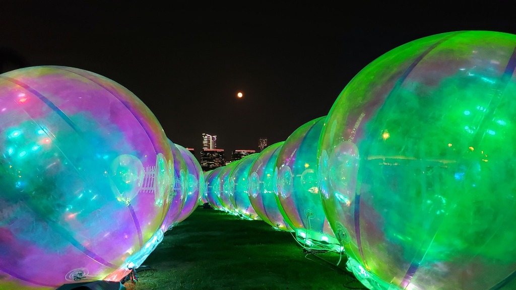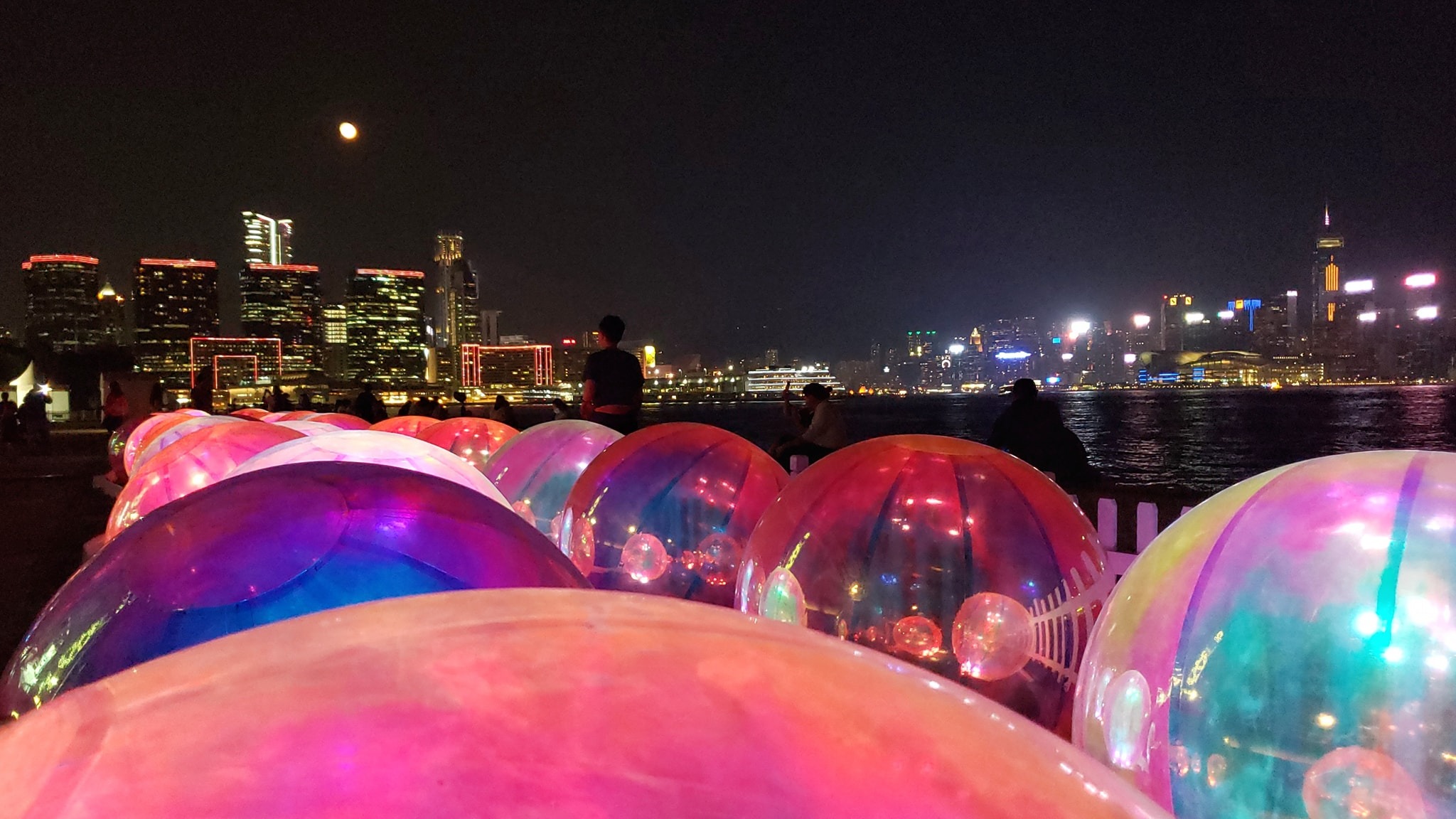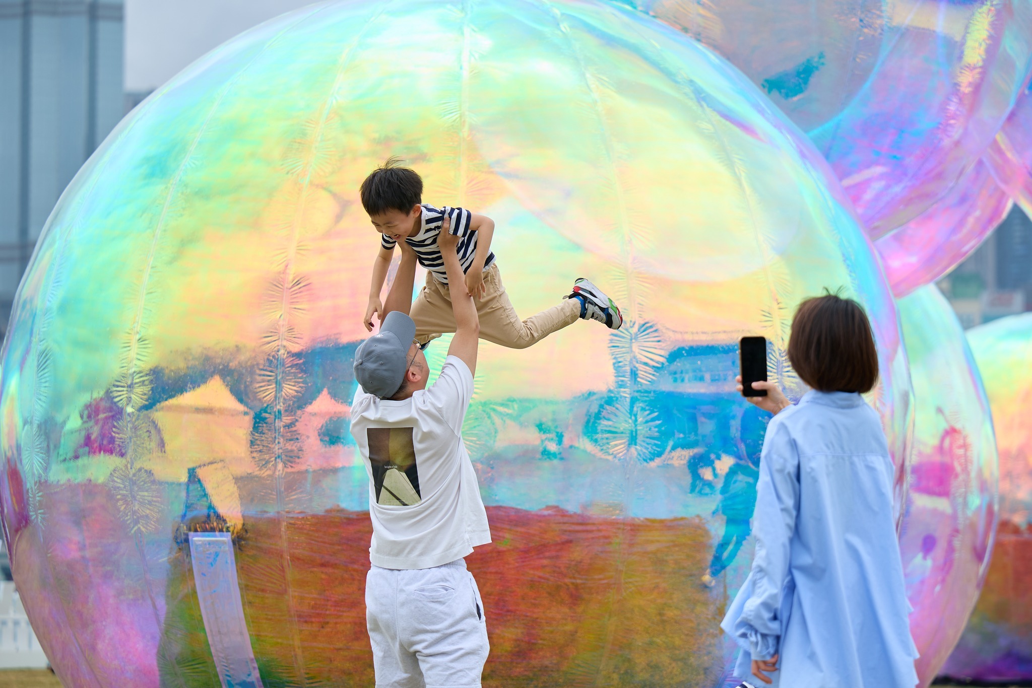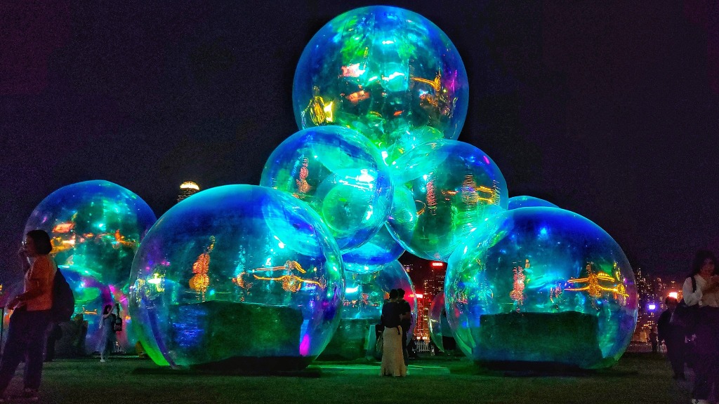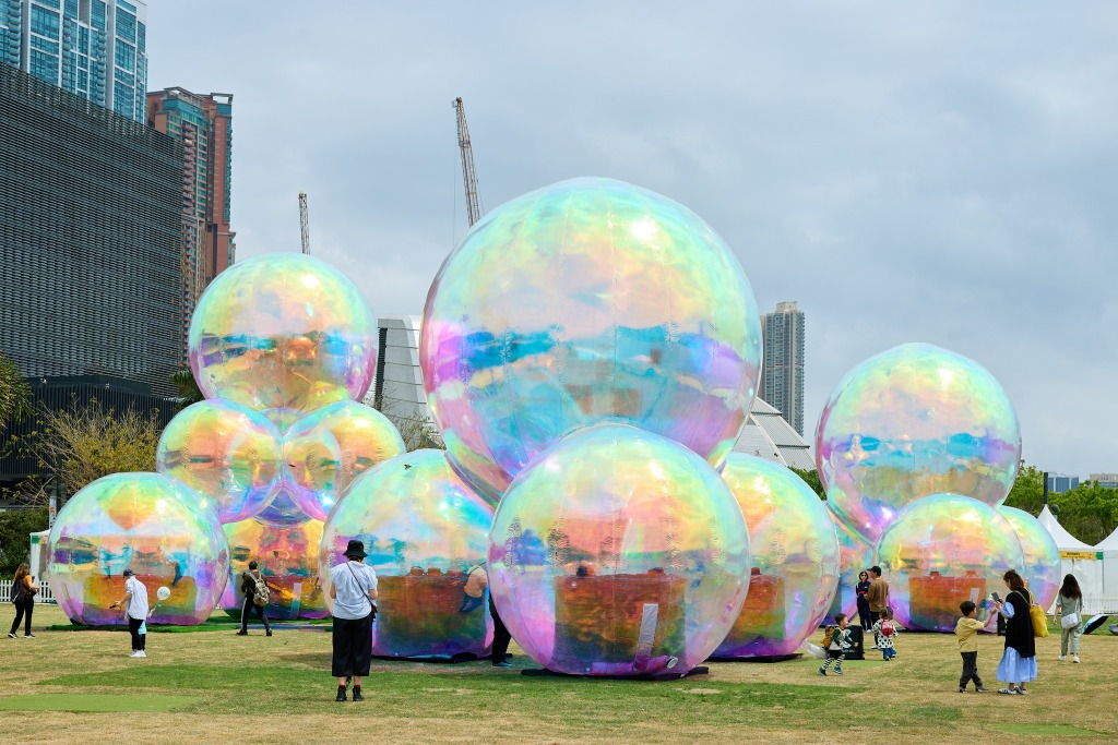 在添馬公園對岸的西九文化藝術區草地上,發光的泡泡裝置同樣精彩。這個名為Atelier Sisu 《抱泡瞬間》的藝術展,是「西九家FUN藝術節」的大型展覽。該展覽在海濱草坪上布置多個巨型泡泡,泡泡內有不同展品,在各式燈光影照下,呈現七彩幻變的視覺效果!