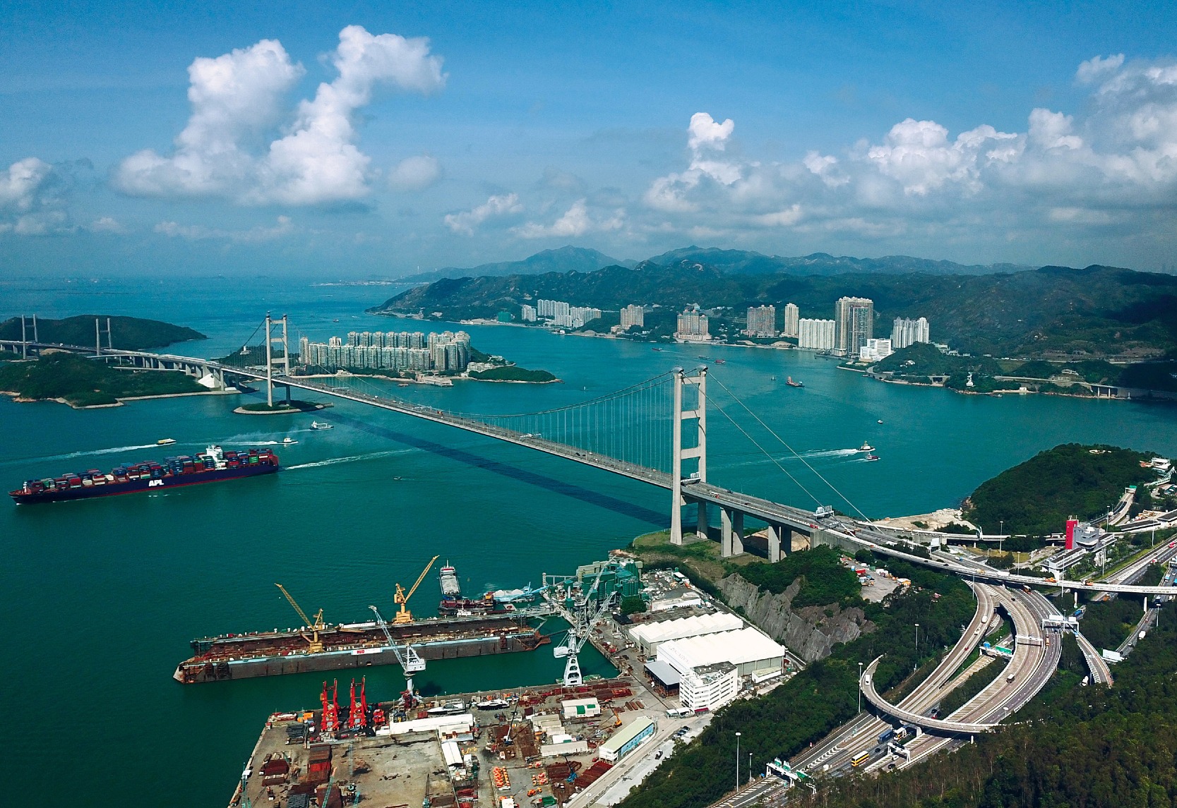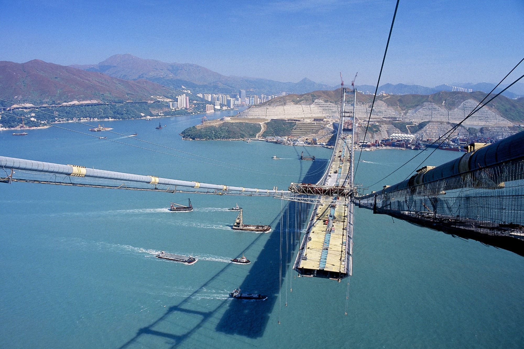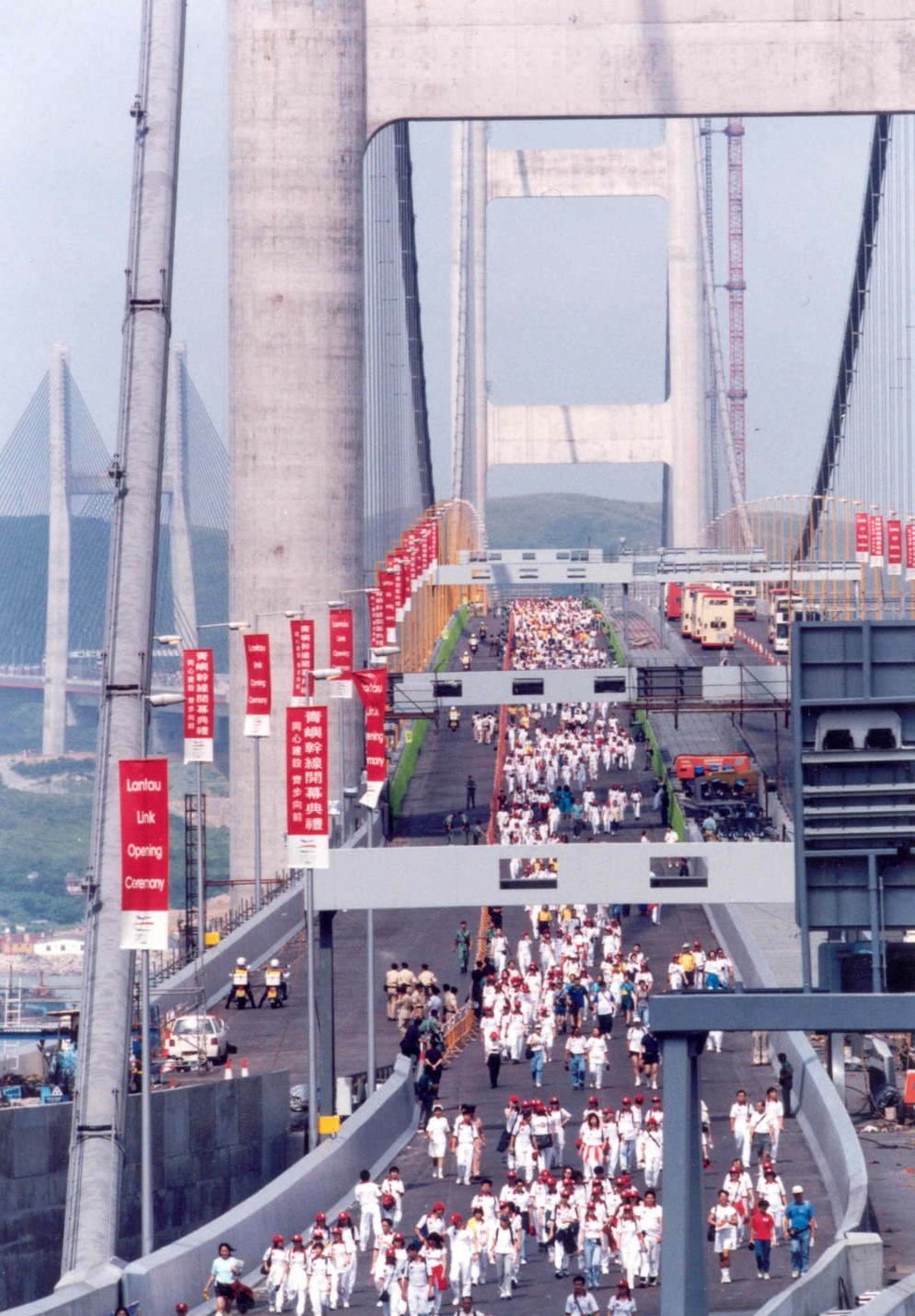 1992年5月動工,花了近五年時間,建成全長2.2公里的青馬大橋。青是指青衣,馬是指馬灣。大橋離海面高度62米,橋塔高度206米,採用雙層設計,上層的橋面是6綫雙程行車的高速公路,下層則是供鐵路東涌綫及機場快綫,以及兩條在緊急時(例如颱風吹襲)使用的行車道路。