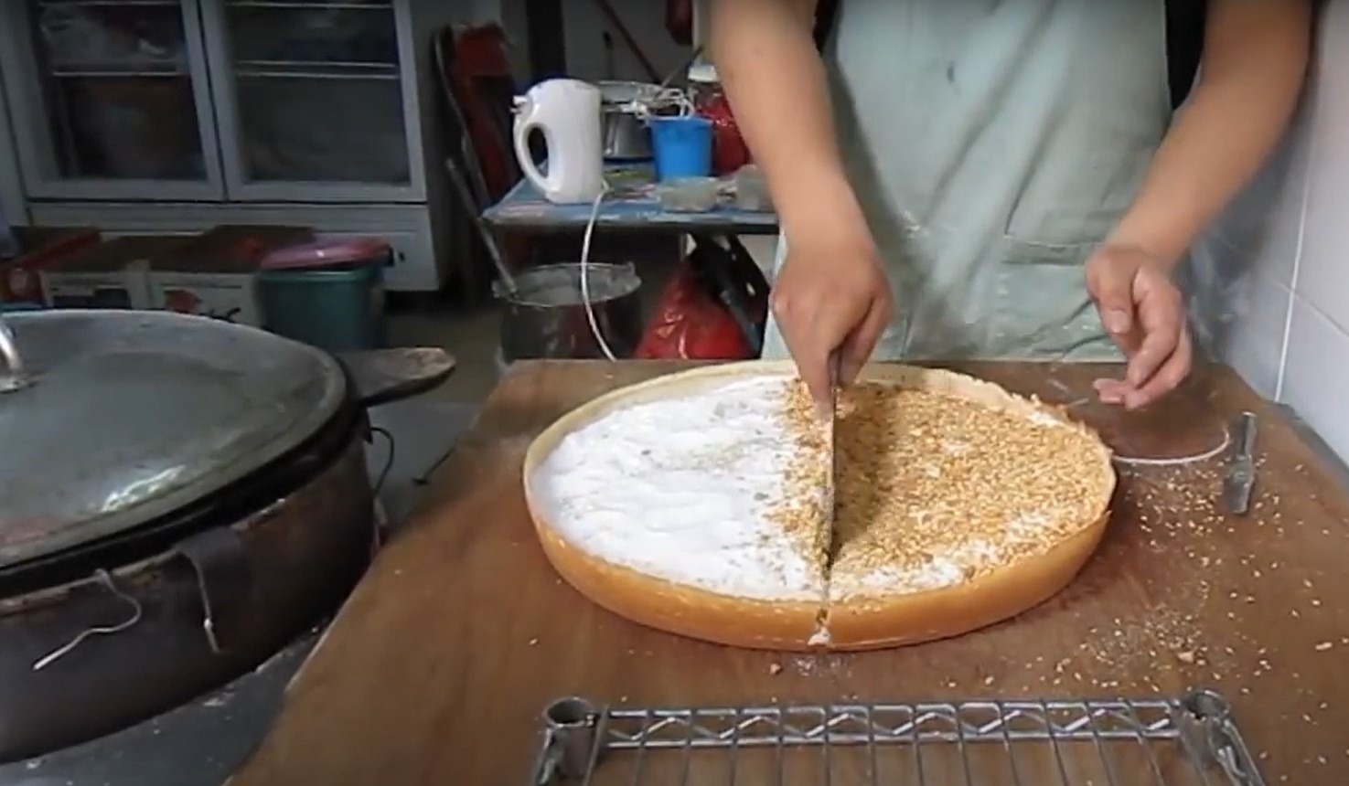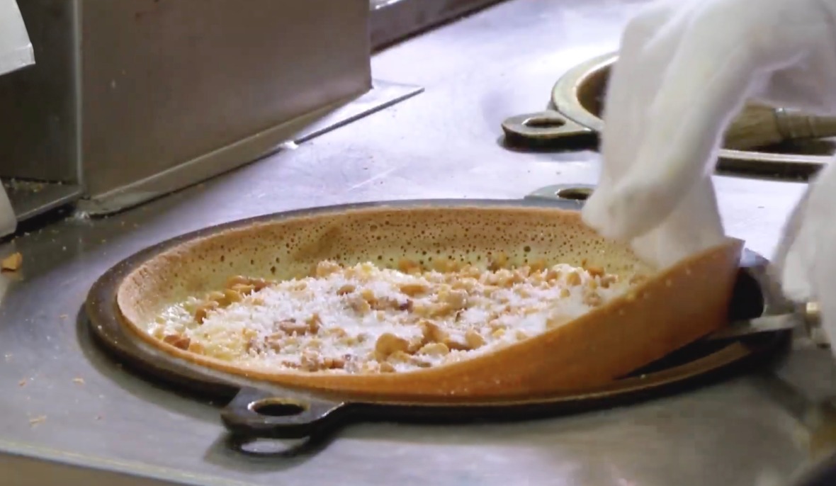 其實潮洲冷糕是在加熱的蛋漿上,灑上芝麻、花生、椰絲、砂糖等,然後對摺切成三角形的「冷糕」。因為冷糕會加入大量砂糖,所以又被稱為「砂糖夾餅」。