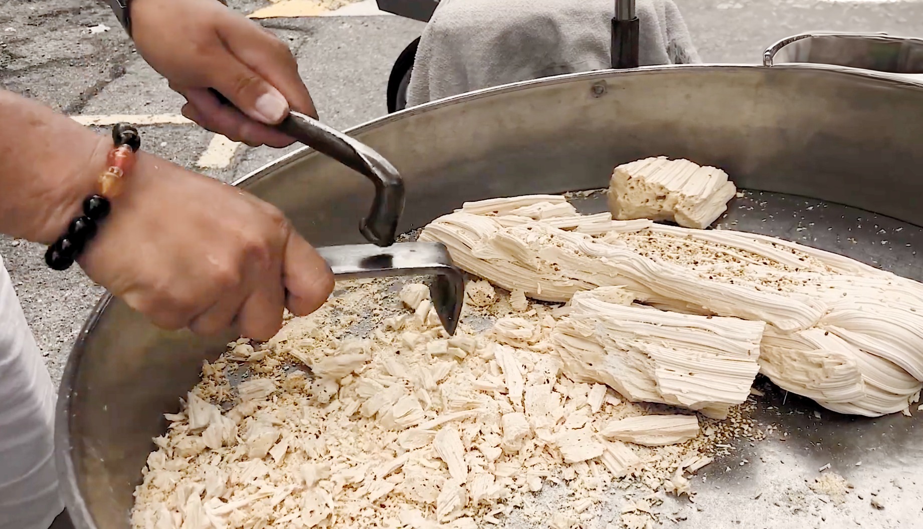 啄啄糖究竟是甚麼?其實是將麥芽糖煮熔,加入芝麻和薑味,經不斷攪拌後,在其未完全凝固前,放到鐵枝拉成糖膠,然後把條狀糖膠綑綁成盤狀。待其凝固及冷卻變硬,就可以用鎚子敲碎糖果來售賣了。