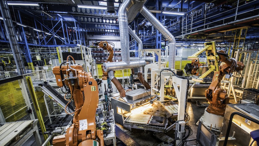 位於佛山高新區順德園的美的(Midea)廚熱(廚房和熱水事業部)順德工廠內,自動導引運輸車和機械手臂在車間按智能指示進行任務。