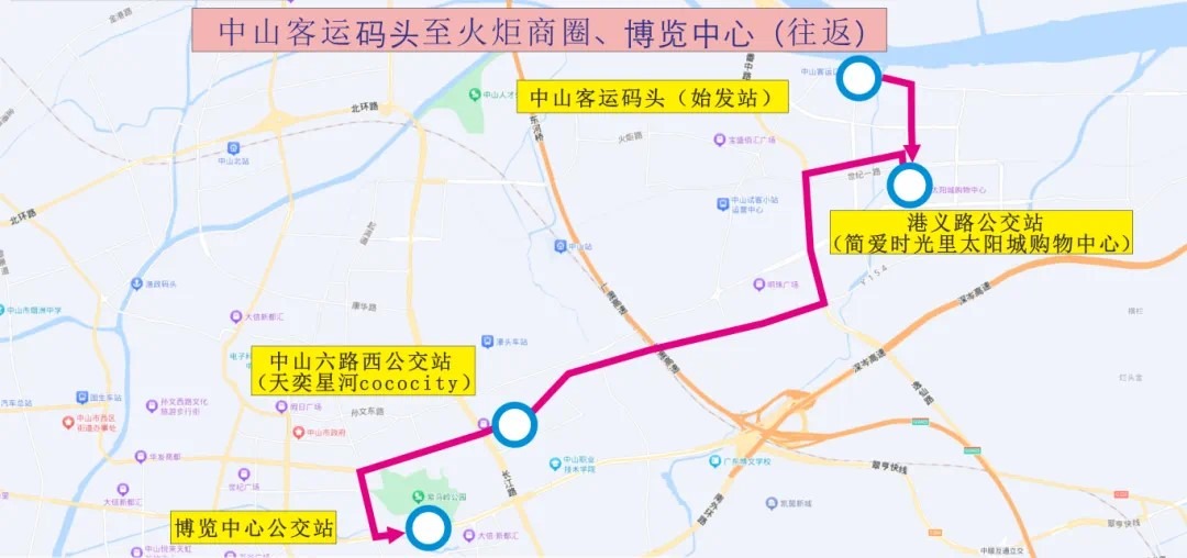 中山客運碼頭、簡愛時光里太陽城購物中心(港義路公交站)、天奕星河COCO City(中山六路西公交站)、博覽中心站