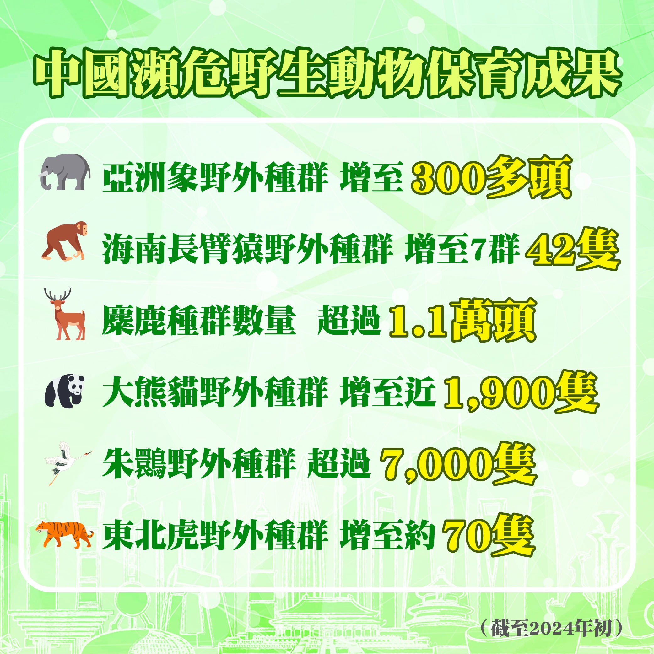 多年來,中國透過瀕危物種拯救工程、棲息地保護建設等,令300多種珍稀瀕危野生動植物種實現恢復性增長,棲息地環境穩步改善。