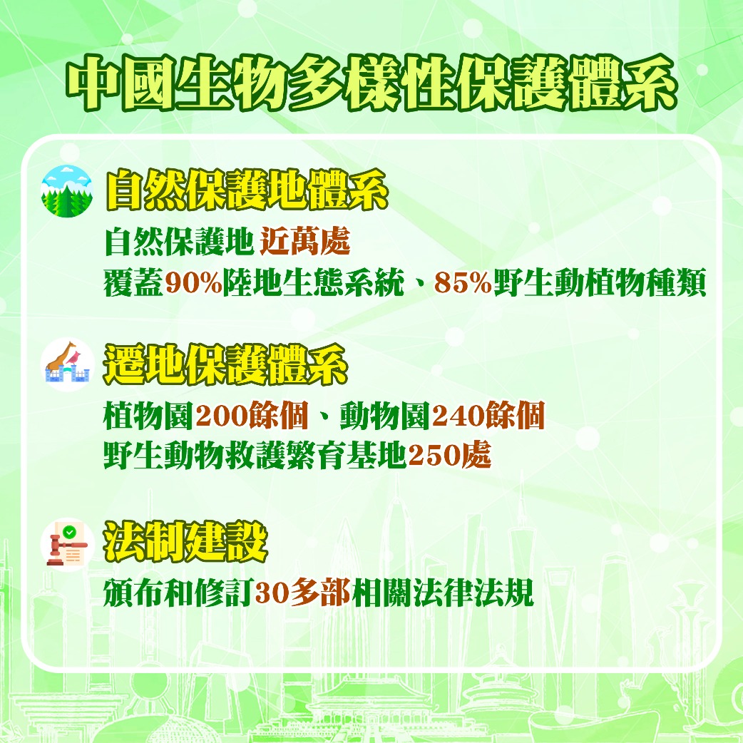 目前,中國已建立各級各類自然保護地近萬處,約佔陸域國土面積的18%; 90%的陸地生態系統類型、85%的野生動植物種類,得到有效保護。