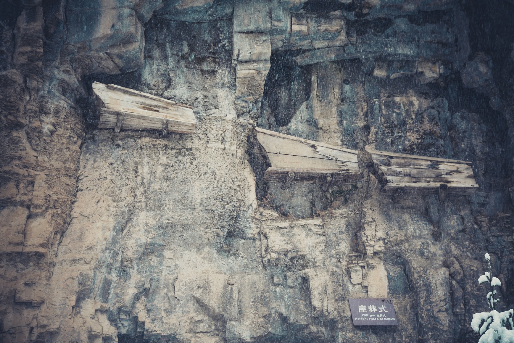 在石門内,可見懸掛在石壁上的木棺,有的用木樁支撑,有的則是用鐵鏈捆鎖,高低不一,有的近百米高,也有數十米高,形成一片壯觀景象。