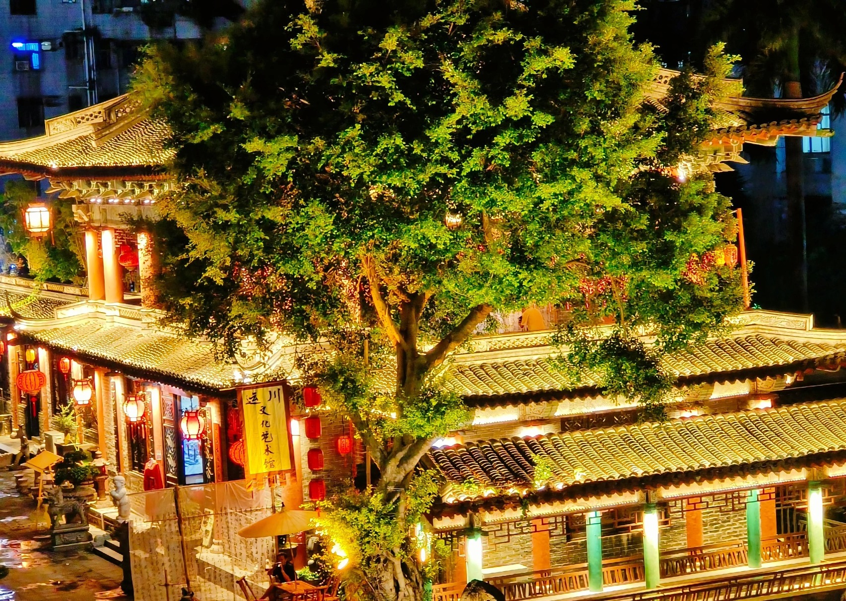 晚上亮燈後,古建細節盡現,萬景樓更具味道,帶上燈籠,穿上漢服,漫步賞月。