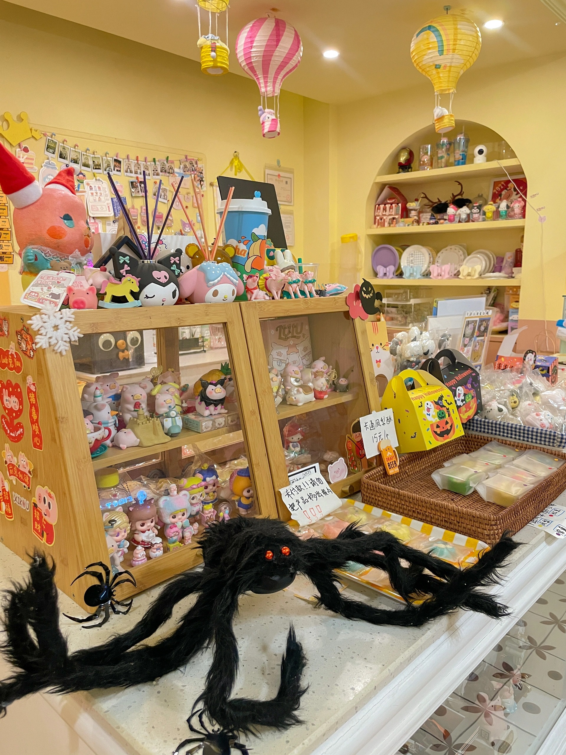 這間店主打精緻甜品及茶飲,店內以卡通豬為主打,還有許多不同的漫畫角色:多啦A夢、鹹蛋超人、布甸狗等等,整間甜品店就像七彩繽紛的漫畫世界一樣,非常夢幻。