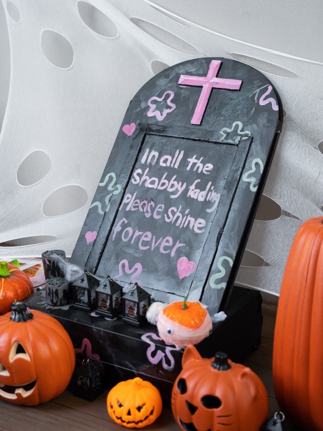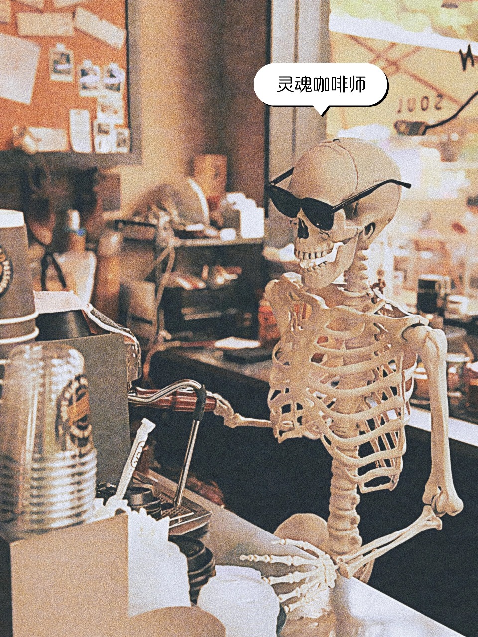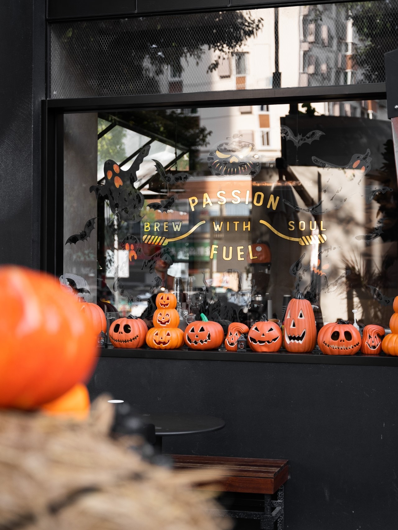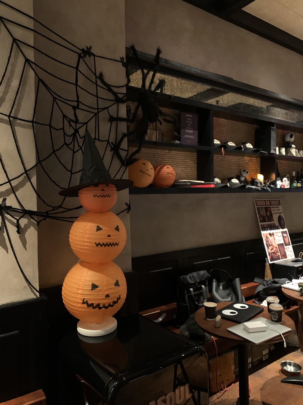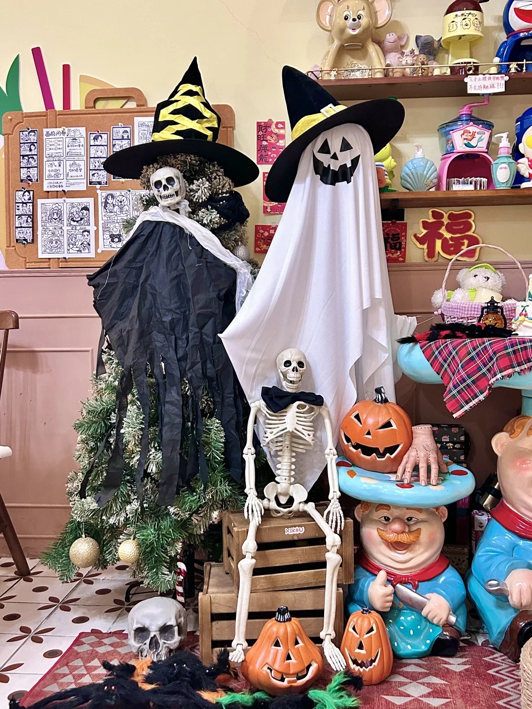 萬聖節這期間,店長加入大量西方鬼怪元素,別具特色。店門前擺滿各式南瓜頭,店內沙發旁「坐着」一幅仿製人骨,頭戴紳士帽,吸引了不少客人到來打卡。店中一角,還特設一座西方「墓碑」,蜘蛛網、蠟燭處處,幽靈味道十足。