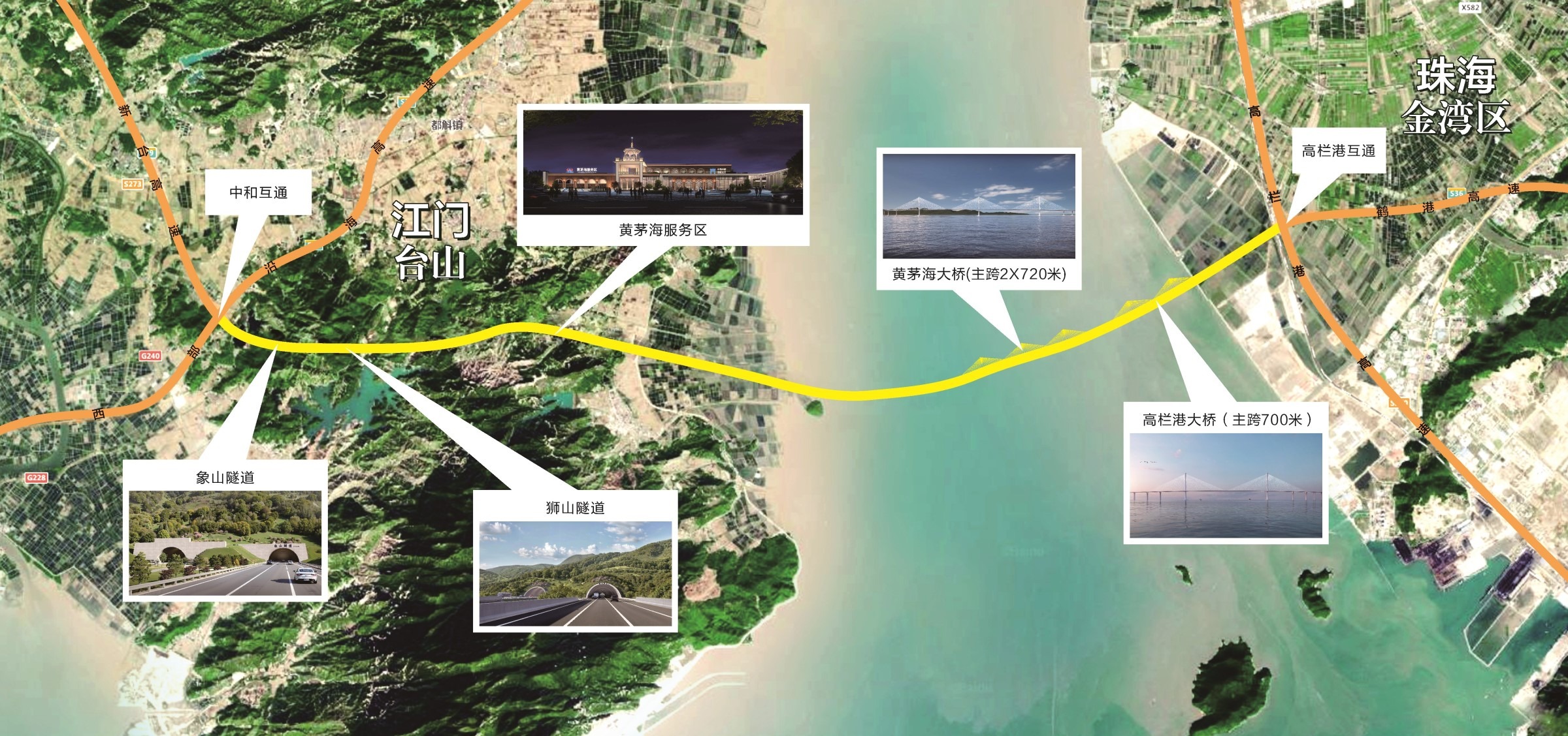 黃茅海跨海通道東接鶴港高速,西連新台高速並與西部沿海高速相交,採用雙向六車道高速公路標準,設計時速100公里/小時,設計使用壽命100年,造價約129.85億元。
