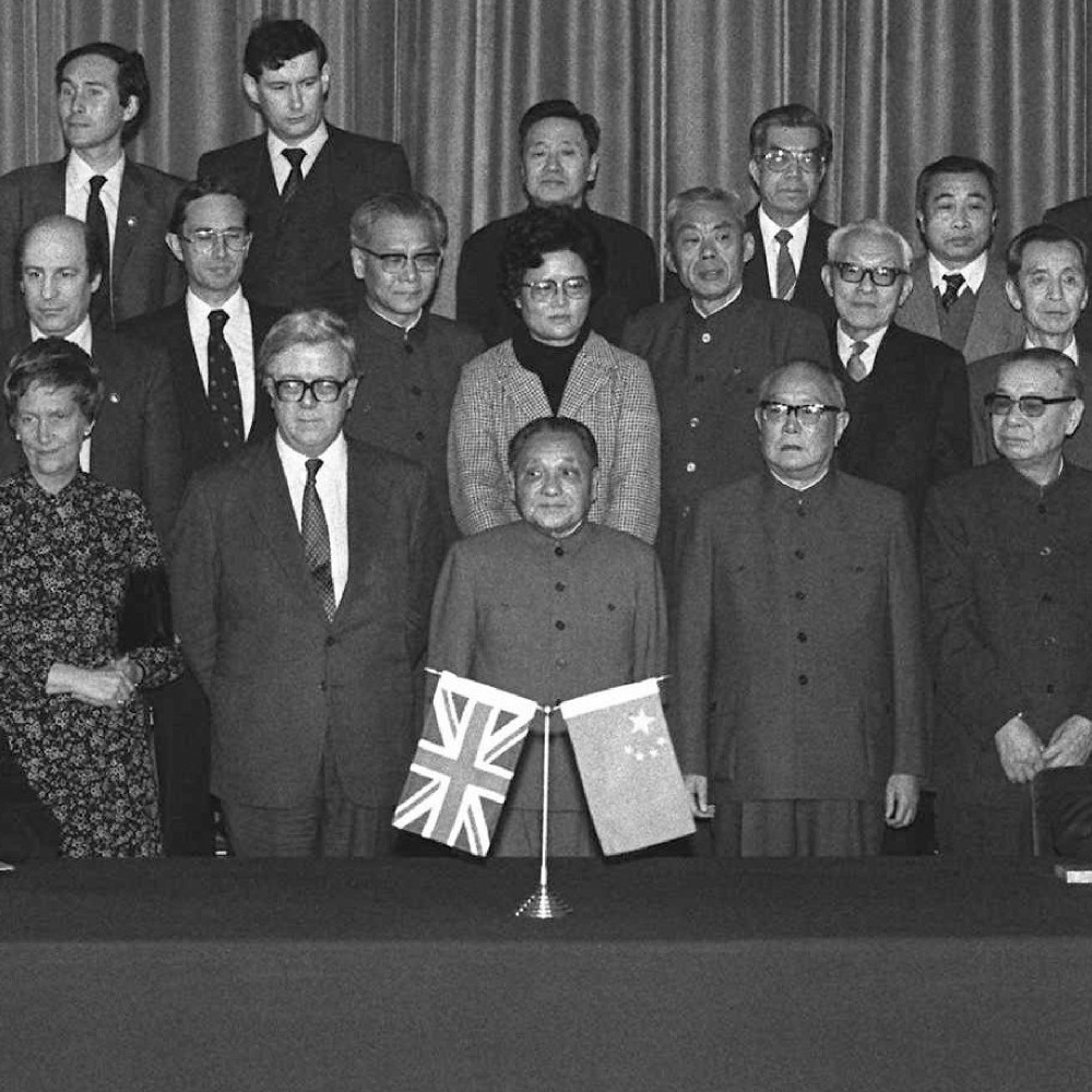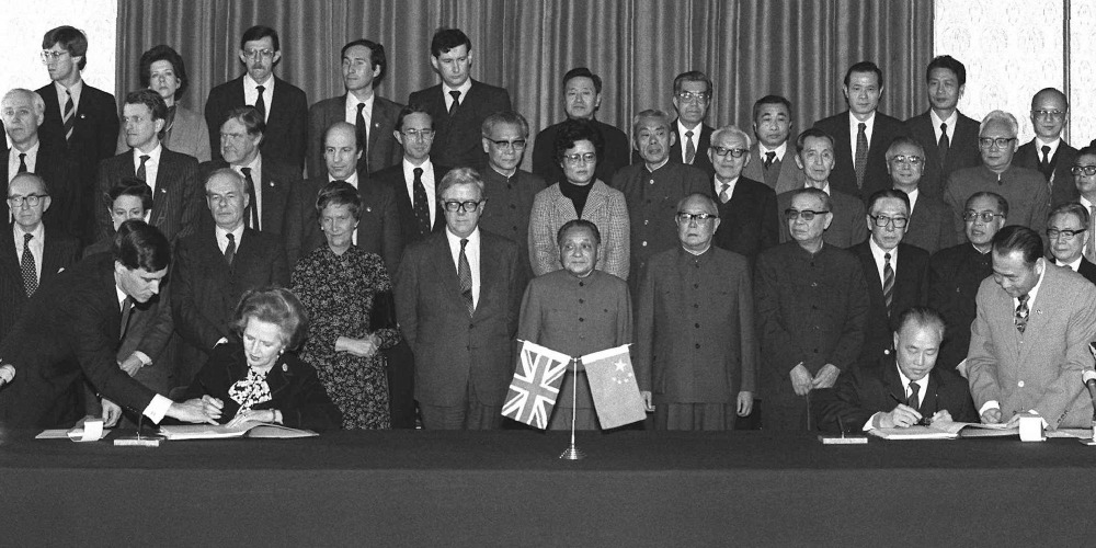 那一天,英國首相戴卓爾夫人穿戴精緻,白色碎花恤衫外配一襲黑紫色套裝,頸上掛上一串珍珠,還配襯了一套紅寶石、綠寶石和藍寶石耳環、手鍊和戒指,十分隆重。她坐在大廳正中的長桌的一端,隨從人員呈上《中英聯合聲明》,她鋼筆一揮,英國於幾百萬港人的道義和責任,從此劃了句號。另外,鄧小平的一國兩制制度得以展開。