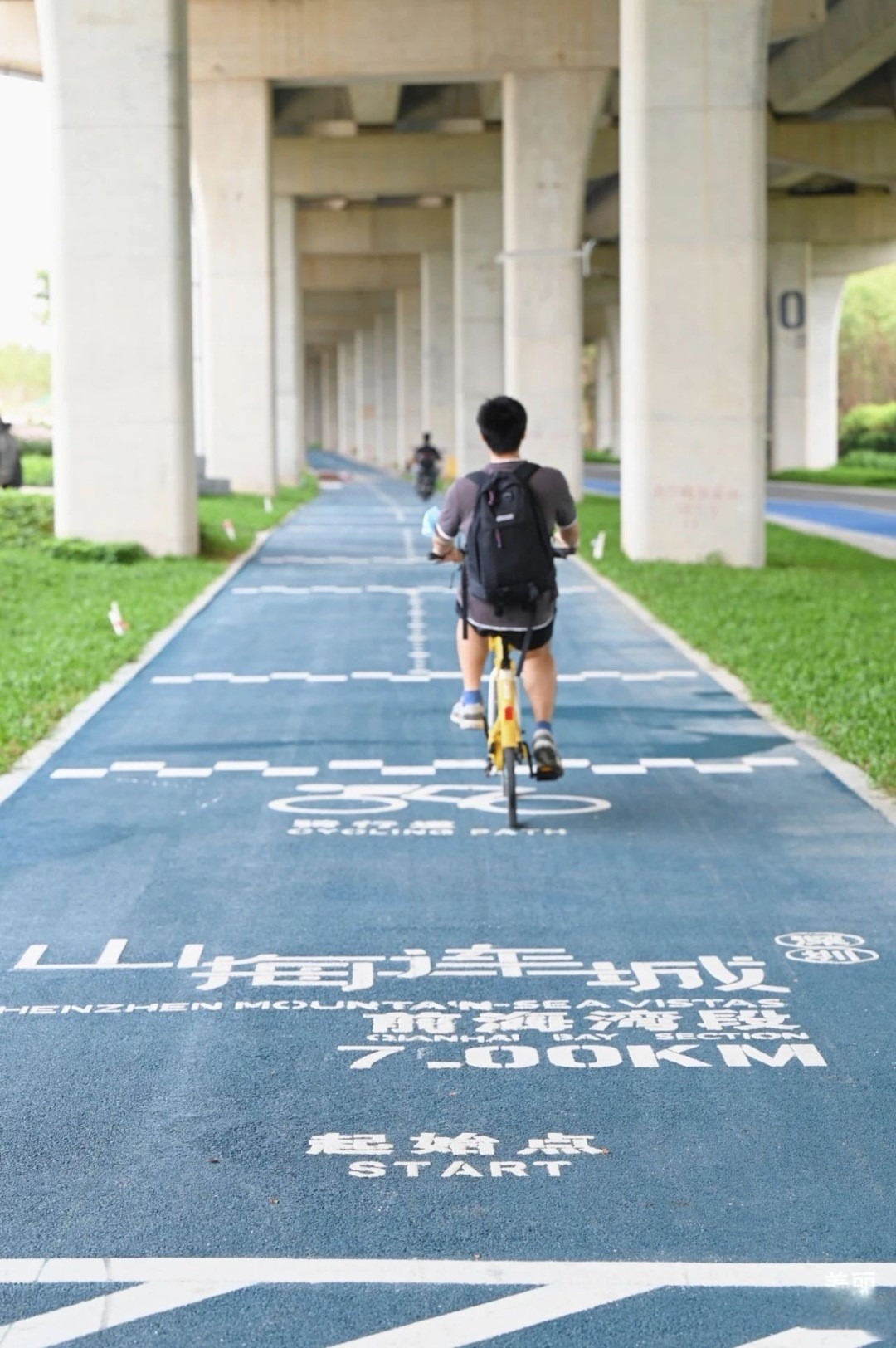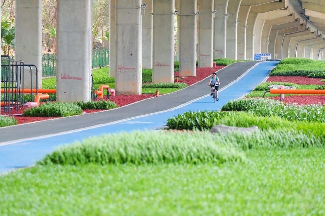 離開歡樂港灣,跨過一段路面,很快就來到廣深沿江高速橋底綠道了,這裏的「山海連城—前海段」,就是綠道的開始。