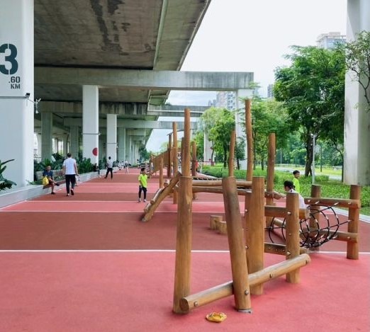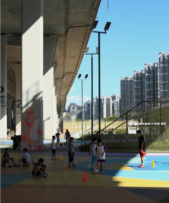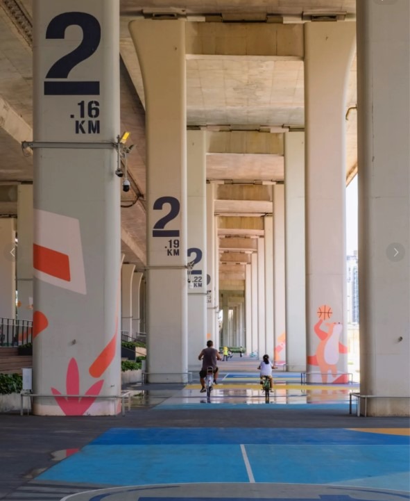 沿着藍色的路面而行,在「2公里」標誌附近就有另一個遊樂場,名為「藍球聚場」。這裏有一些露天籃球場可供人玩樂,橋底下有大片空地,又是一個可以小休的地方。