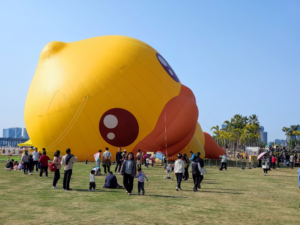 在演藝公園大草坪,有高達20米的吹氣小黃鴨躺在草地上,旁邊有不少帳篷坐着享受風景的遊人。小黃鴨其實是一個吹氣遊樂園,有吹氣彈床、吹氣滑梯等遊樂設施。小朋友踏單車來到這裏可以作個小休,順道玩樂一番。