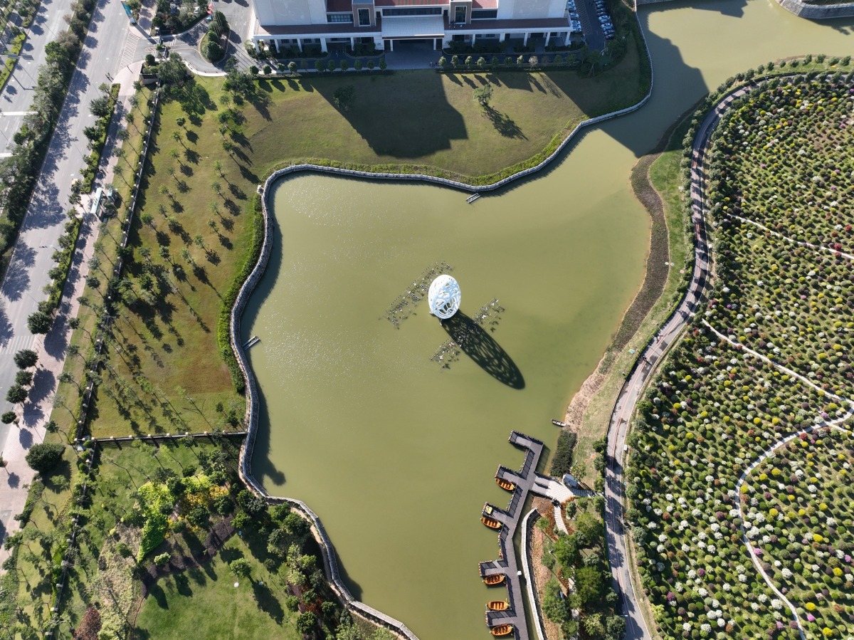 每年這個時候,千花洲生態景區內都是簕杜鵑盛放的黃金時期。在「浪漫花境區」內,有大片球狀簕杜鵑,紅、紫、粉、黃、白色的花束,構成綠意盎然的城市綠洲,從高空看非常震撼。