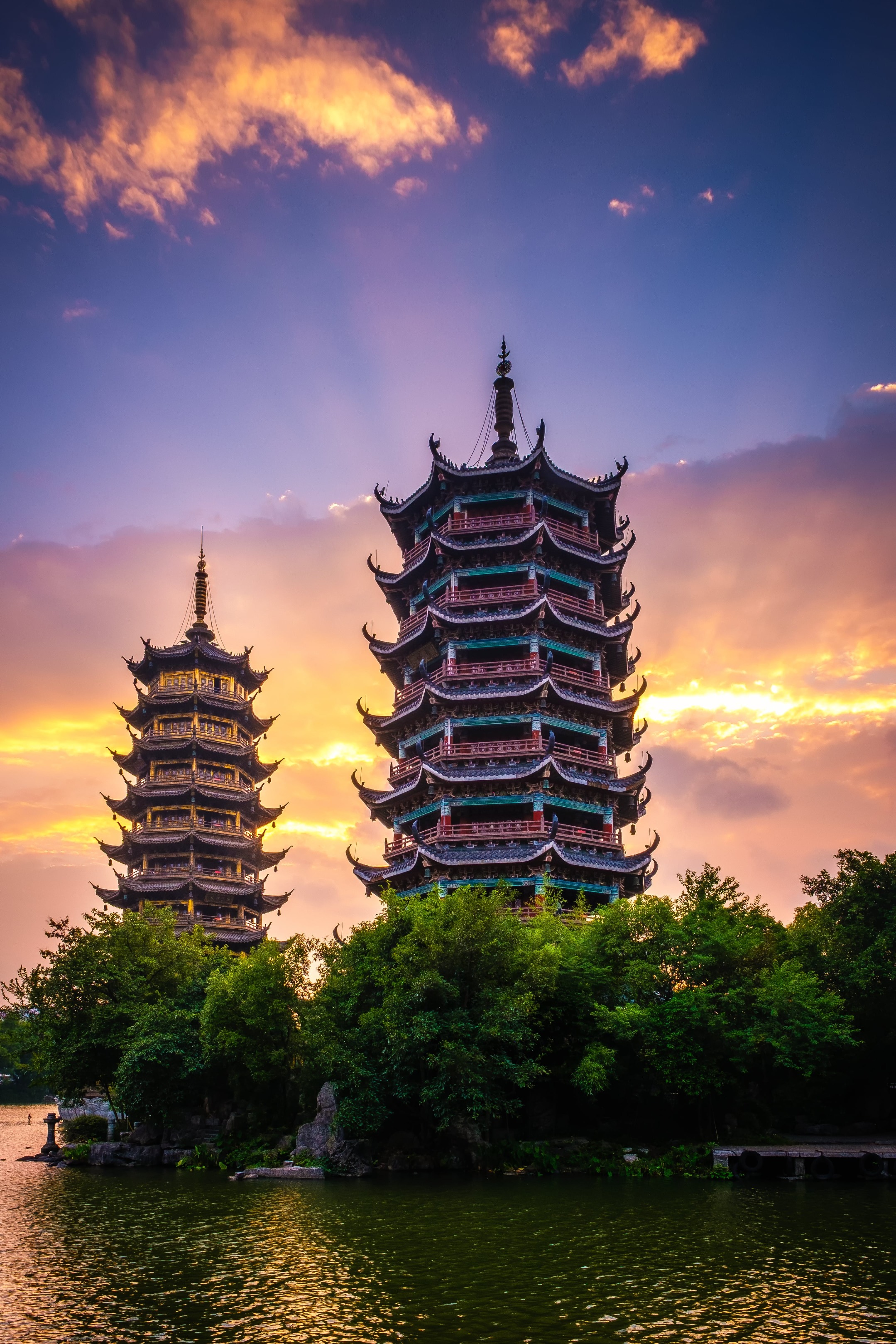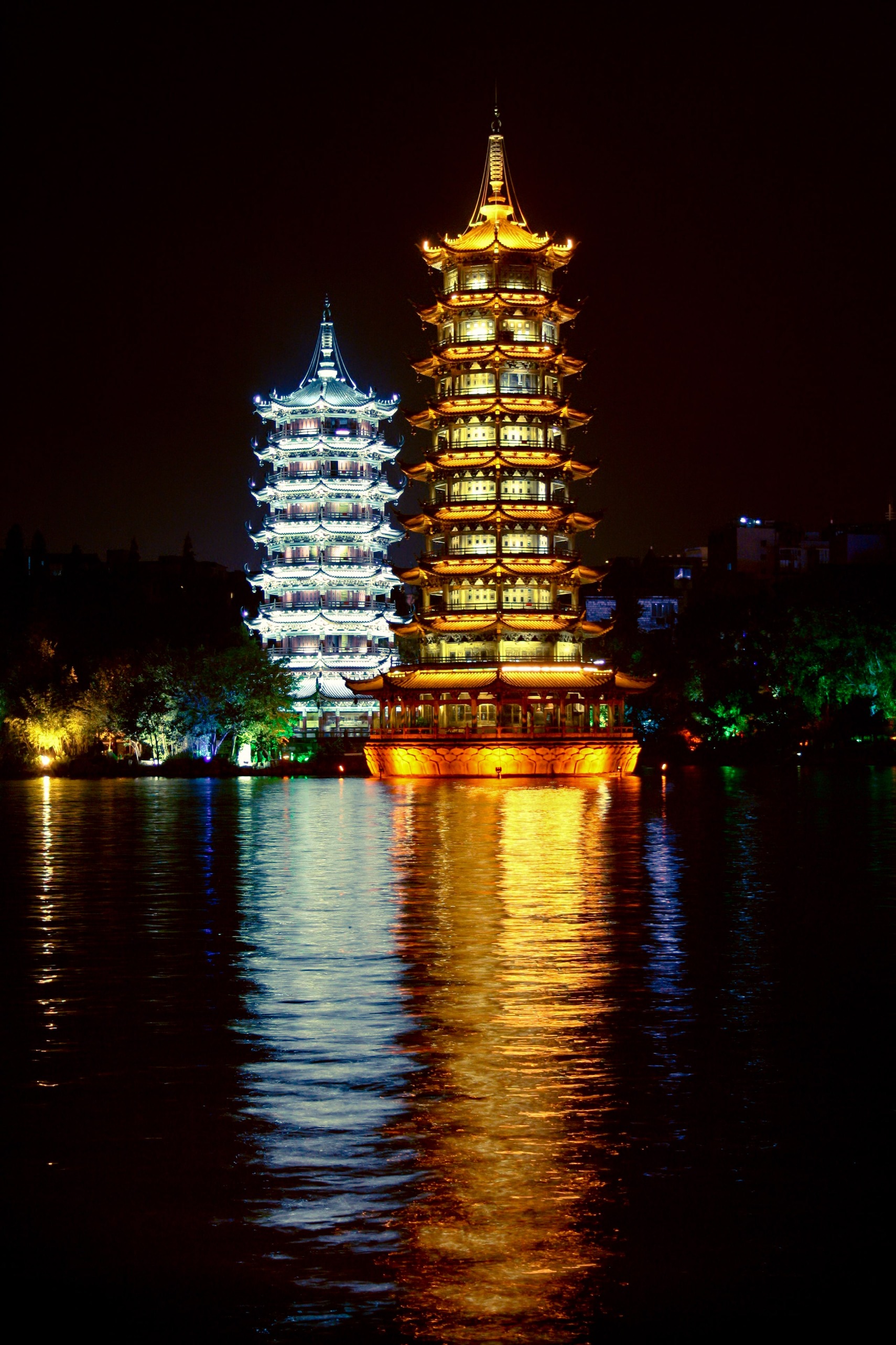 建議大家可在黃昏至晚上時分遊覽日月雙塔,登上雙塔,俯瞰桂林兩江西湖璀璨的夜景,賞心悅目。