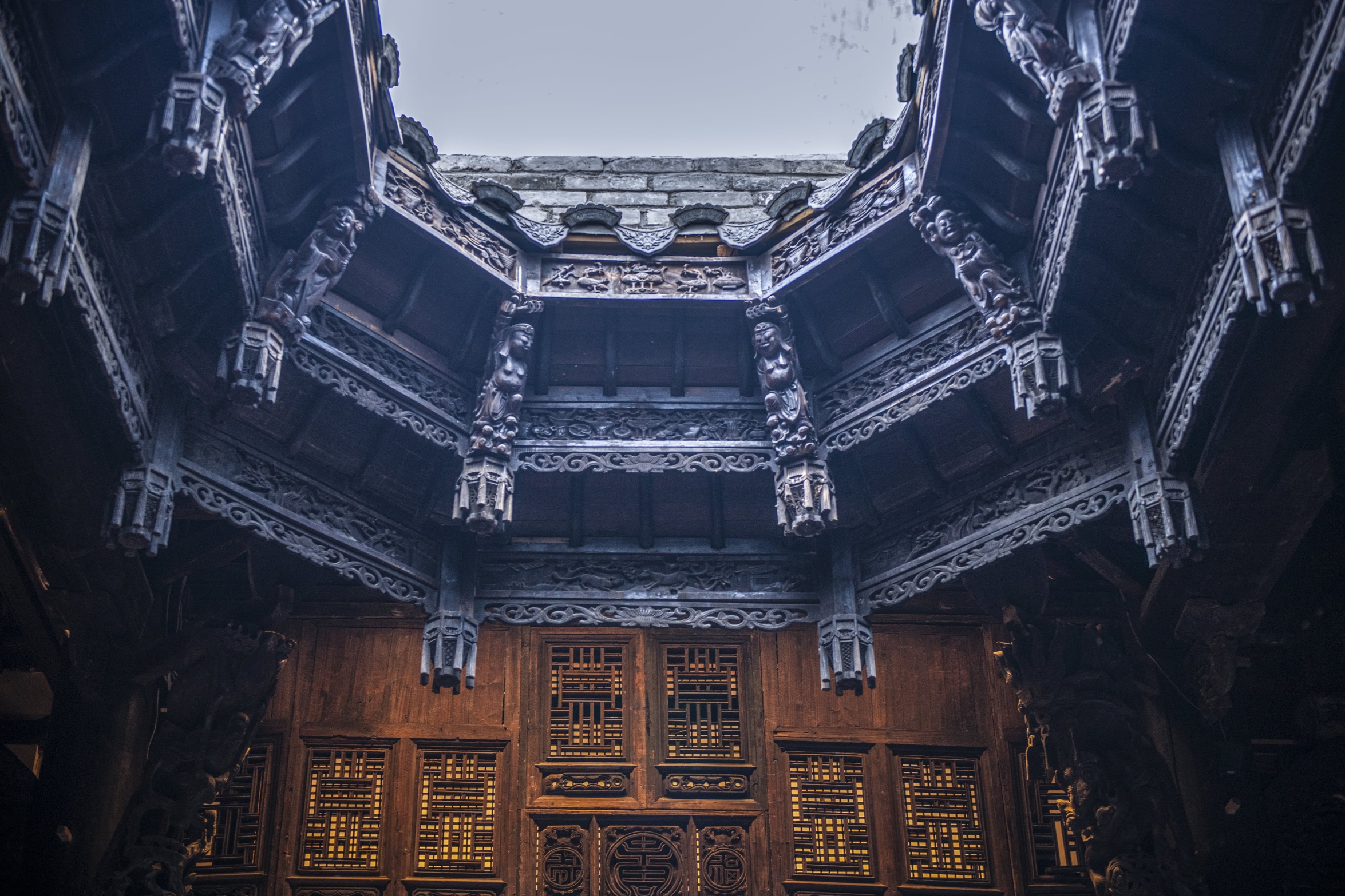 除了馬頭牆,大夫第的高牆、飛檐、峭壁也遍布着精雕細琢的磚雕、石雕、木雕,氣派之餘又不失靈動。在大夫第堂屋中間還有個天井,除了具有採光和通風的作用外,還有一層特殊的寓意——「四水歸堂」,意思是將四方的財富納入府中,頗具特色。