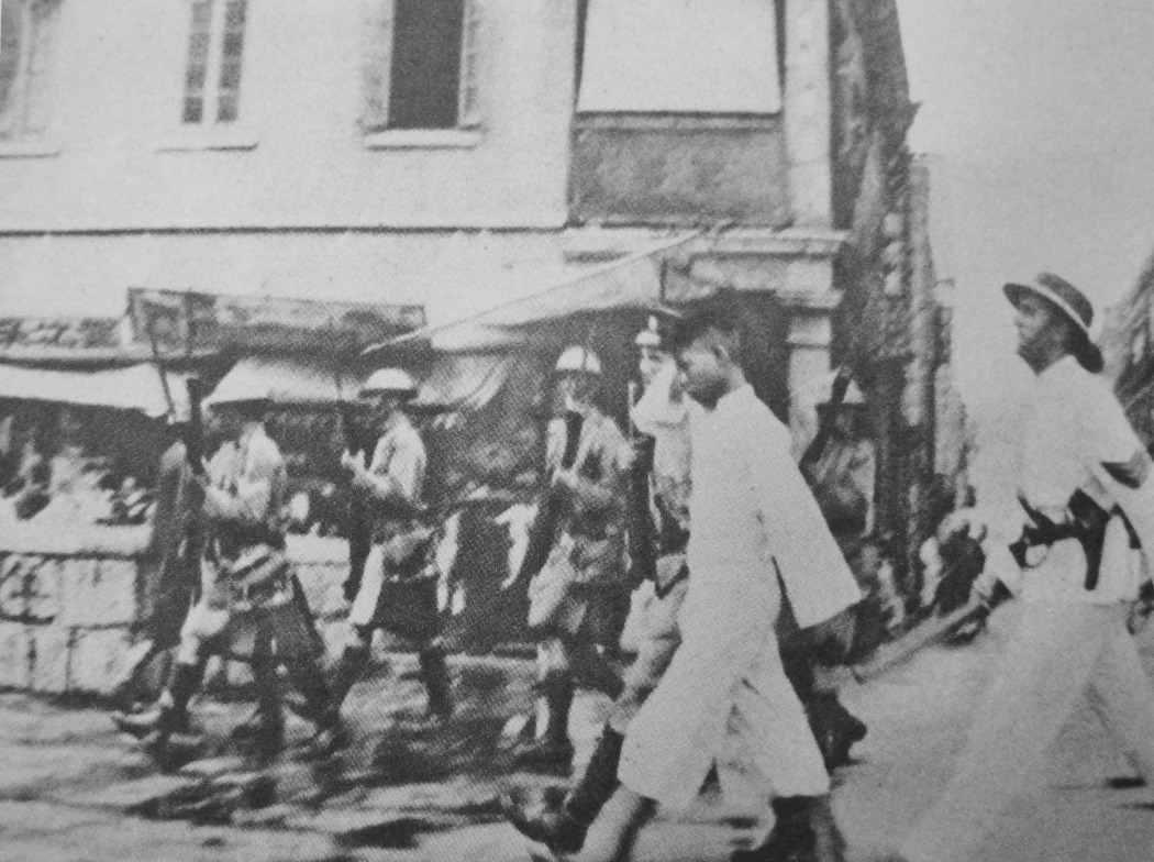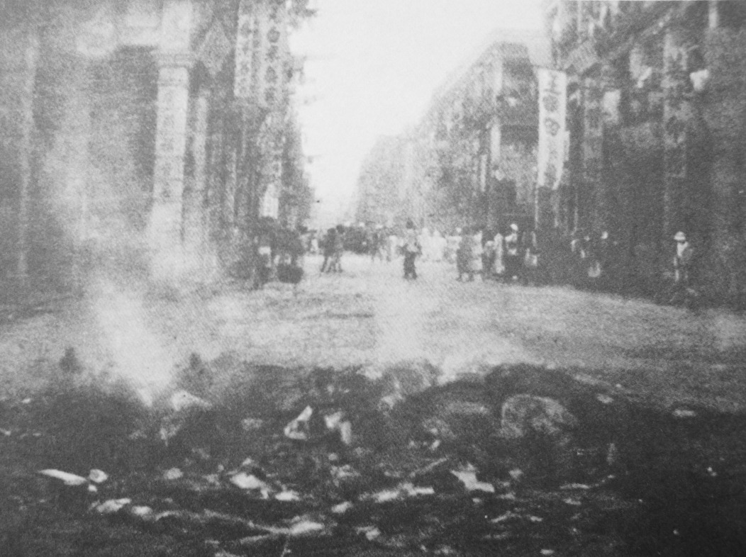 上面這張相片,是90多年前在香港街頭的一幕——大規模示威遊行及焚燒日貨。當中還能隱約看到被燒焦的物品堆裏,冒出白煙,遠處有人聚集。