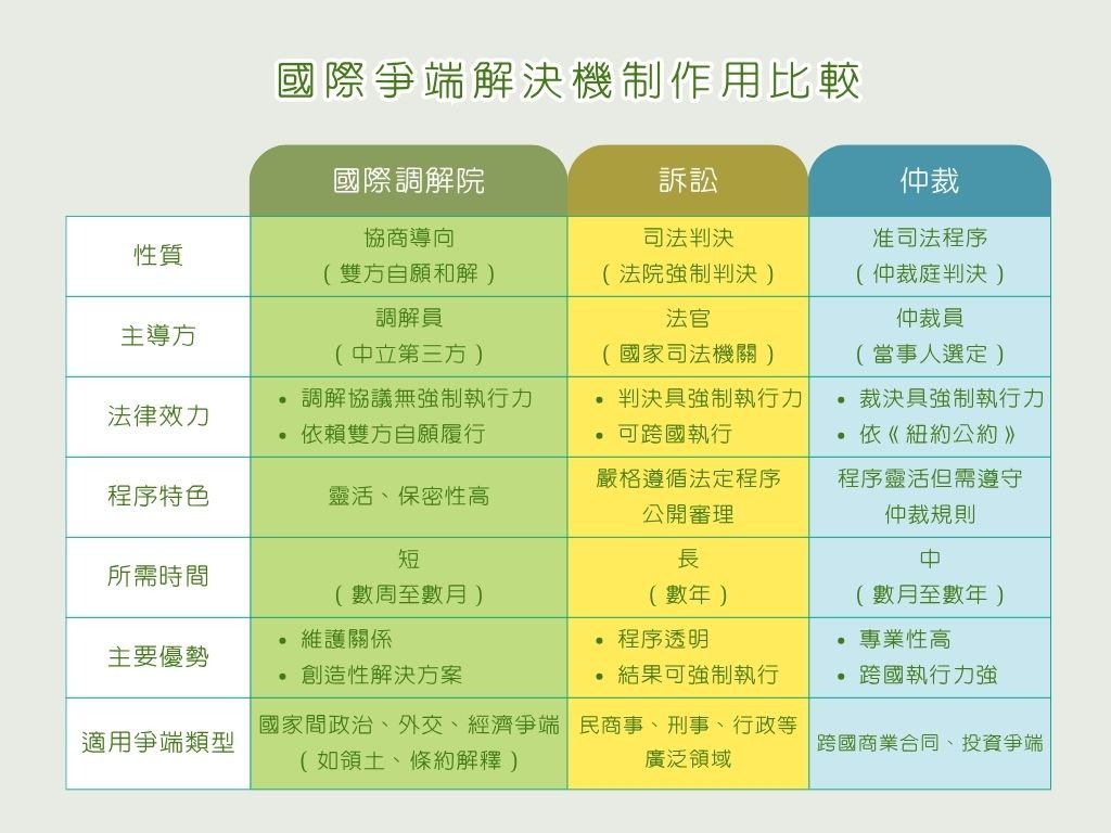 國際調解院成立後,可處理3類不同爭議:第一類是國家和國家之間的爭議,第二類是國家和另一個國家人民之間的爭議,第三類是國際性的商業爭議。