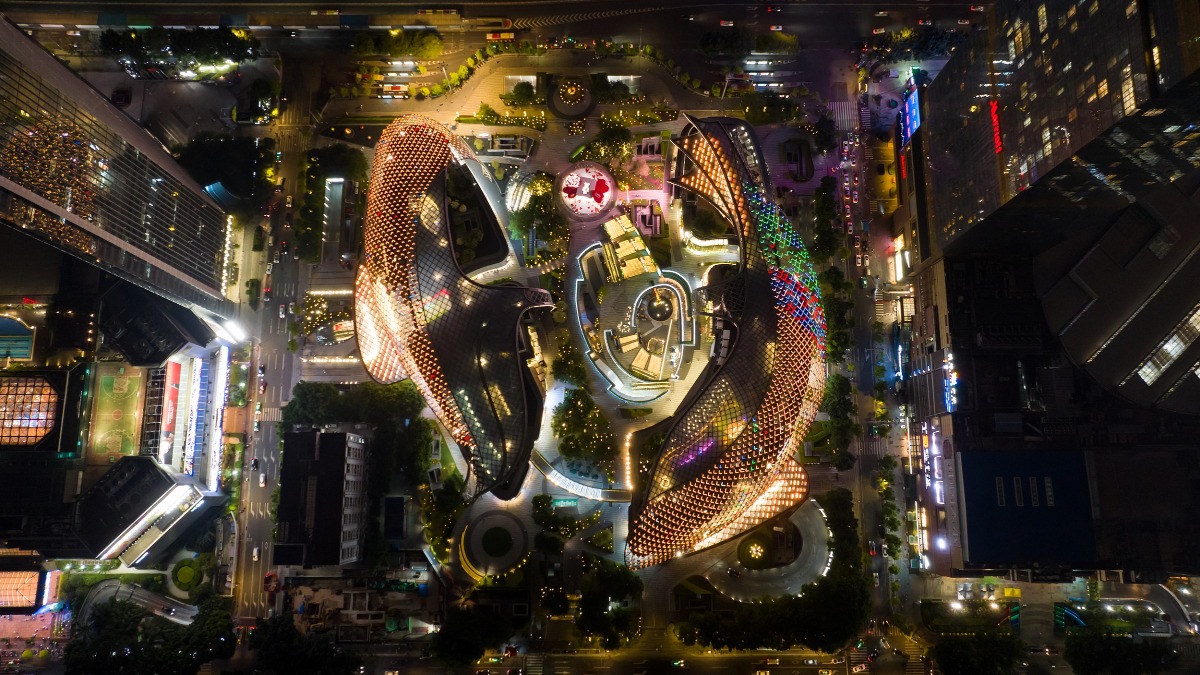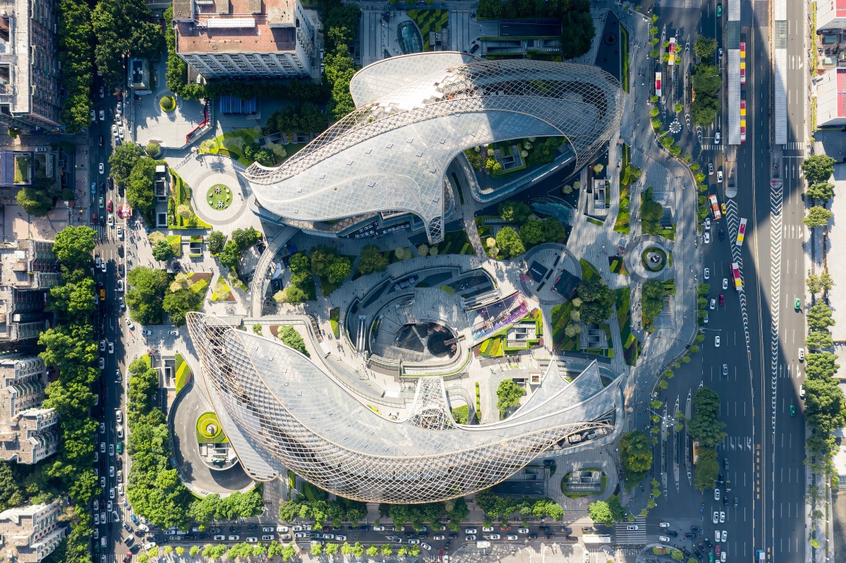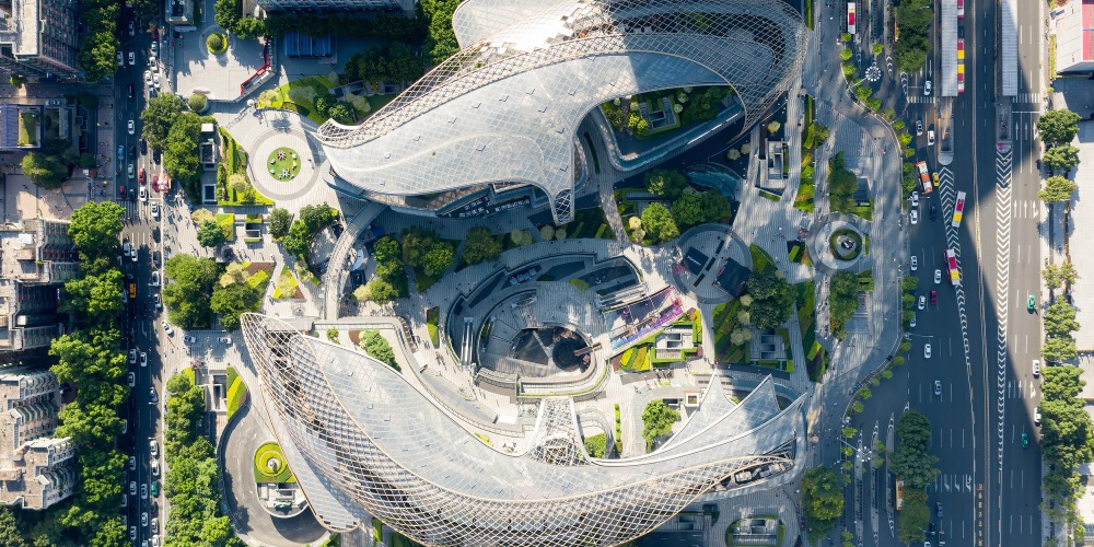 從空中俯瞰,天環廣場頂部建築呈雙橢圖形環狀結構,由東西兩棟弧形建築組成,中間以通透的玻璃頂棚連接,形似躍動的雙魚。