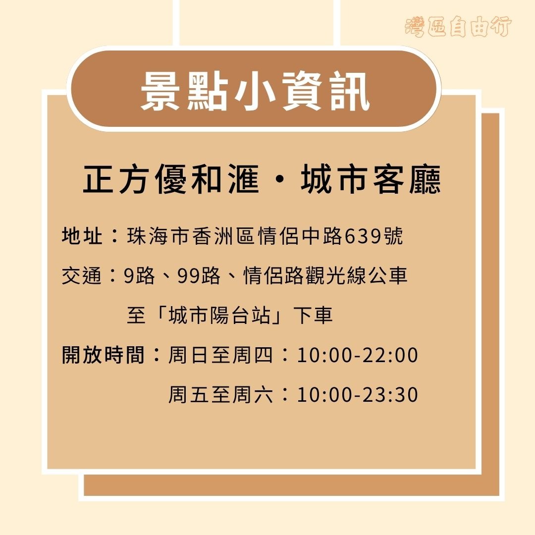 商場共有七層高,名牌首店匯聚。購物之外,它同時定位為「24小時社交潮玩地」,集潮流玩意、科技體驗與創意娛樂於一身,將沉浸式、多元化的娛樂社交體驗帶入珠海消費市場,打造在珠海乃至灣區不可多得的時尚潮玩勝地。商場地下隧道連通海濱泳場、愛情郵局等知名旅遊景點,融匯九洲灣人文自然於一體。
