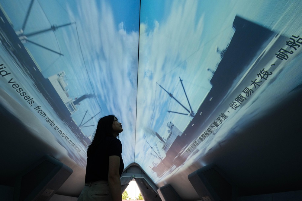 海事廣場的另一焦點是以傳統船隻形態為靈感設計的展亭通道,以沉浸式科技介紹「我們的海洋」和「船舶演變」兩大篇章,配合互動展示屏幕,細訴香港的海事傳奇。