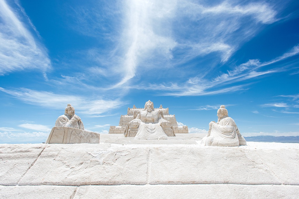 此外,茶卡鹽湖景區還擁有世界紀錄協會認證的世界最大戶外鹽雕藝術群,從遠古傳說的「鹽帝製鹽」到一代天驕「成吉思汗」,每一座鹽雕都栩栩如生,背後蘊含着茶卡鹽湖的悠久歷史,讓人歎為觀止。