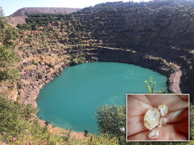 中國的鑽石礦最集中在遼寧。圖為一處已開發完畢的鑽石礦山,小圖為鑽石原石。(網上圖片)
