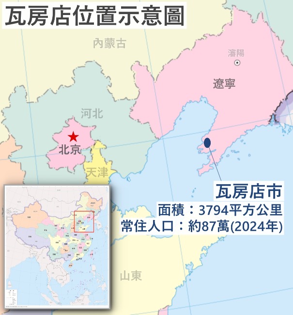 瓦房店目前是大連市代管的縣級市。她地處遼東半島中西側,西瀕渤海,常住人口80多萬。