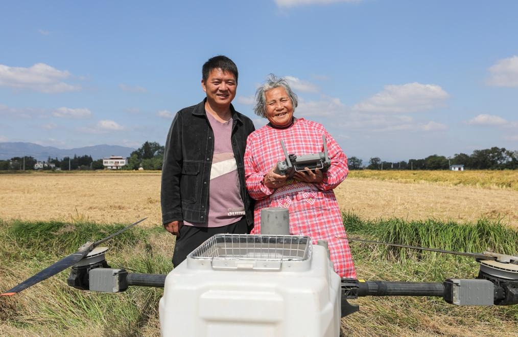 以往大家對農民的刻板印象或許是「面朝黃土背朝天」,工作非常辛勞,但現在新一代人做農業,都懂得借助大量高端科技,如無人機、大型收割機等做農務。戴淑英自覺有一身力氣,在幫忙孫兒做農務時,看到田裏愈來愈多的智慧農機,更從孫兒口中得知,「原本一個人幹一天只能給10幾畝地打藥,用無人機一天就能把600畝都做完,省時省力又省心!」