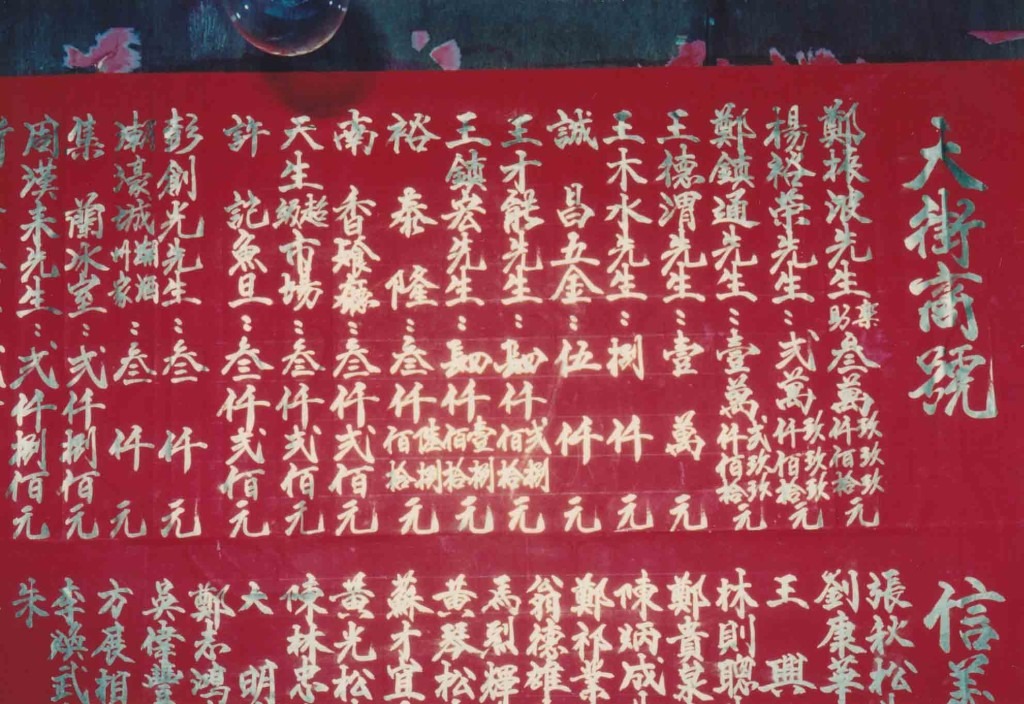 潮人盂蘭勝會的「金榜」寫上值理、商戶、街坊所捐贈善款和福品。