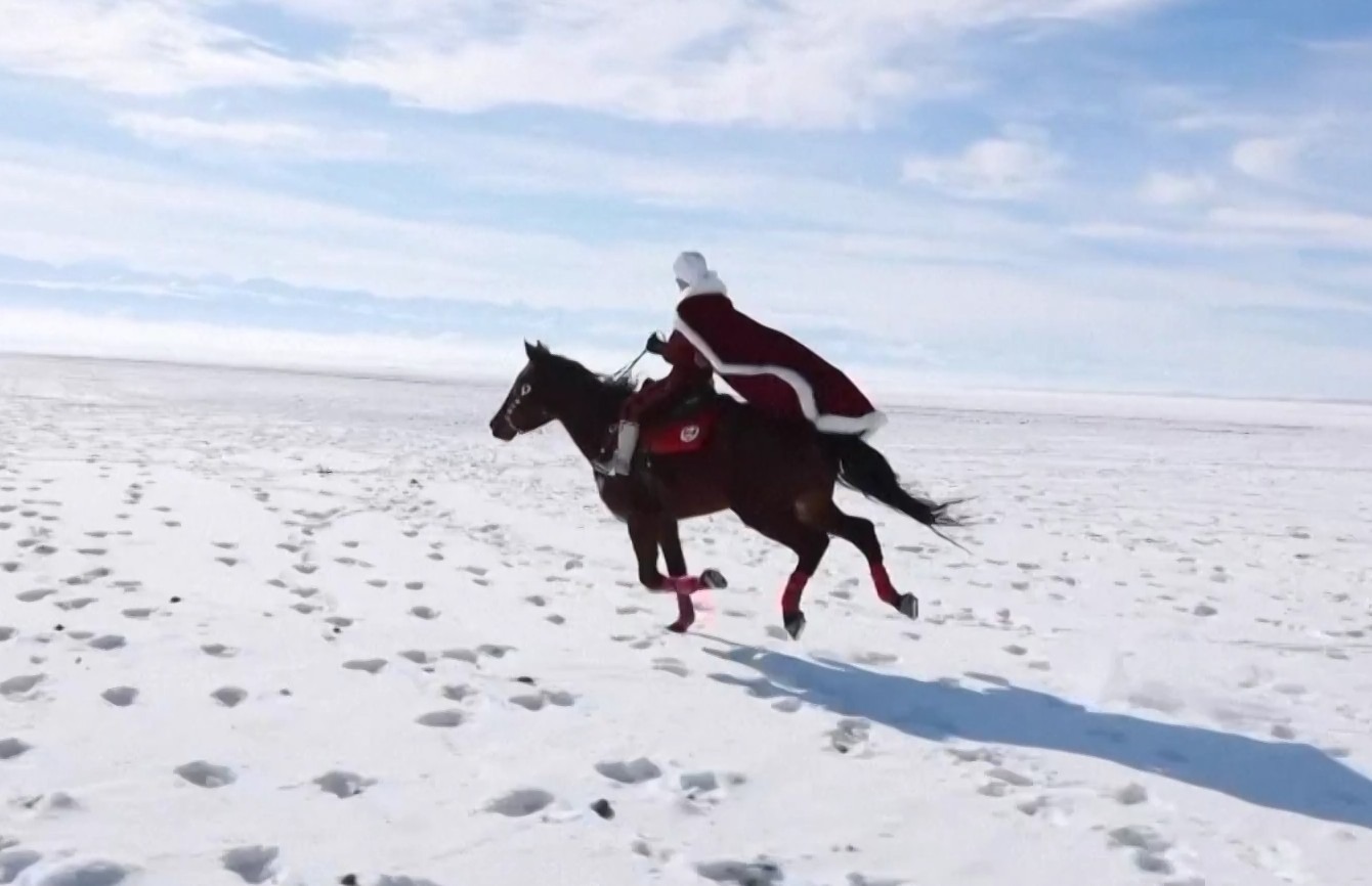賀嬌龍在家郷新疆昭蘇縣策馬雪地上,為當地旅遊作宣傳。