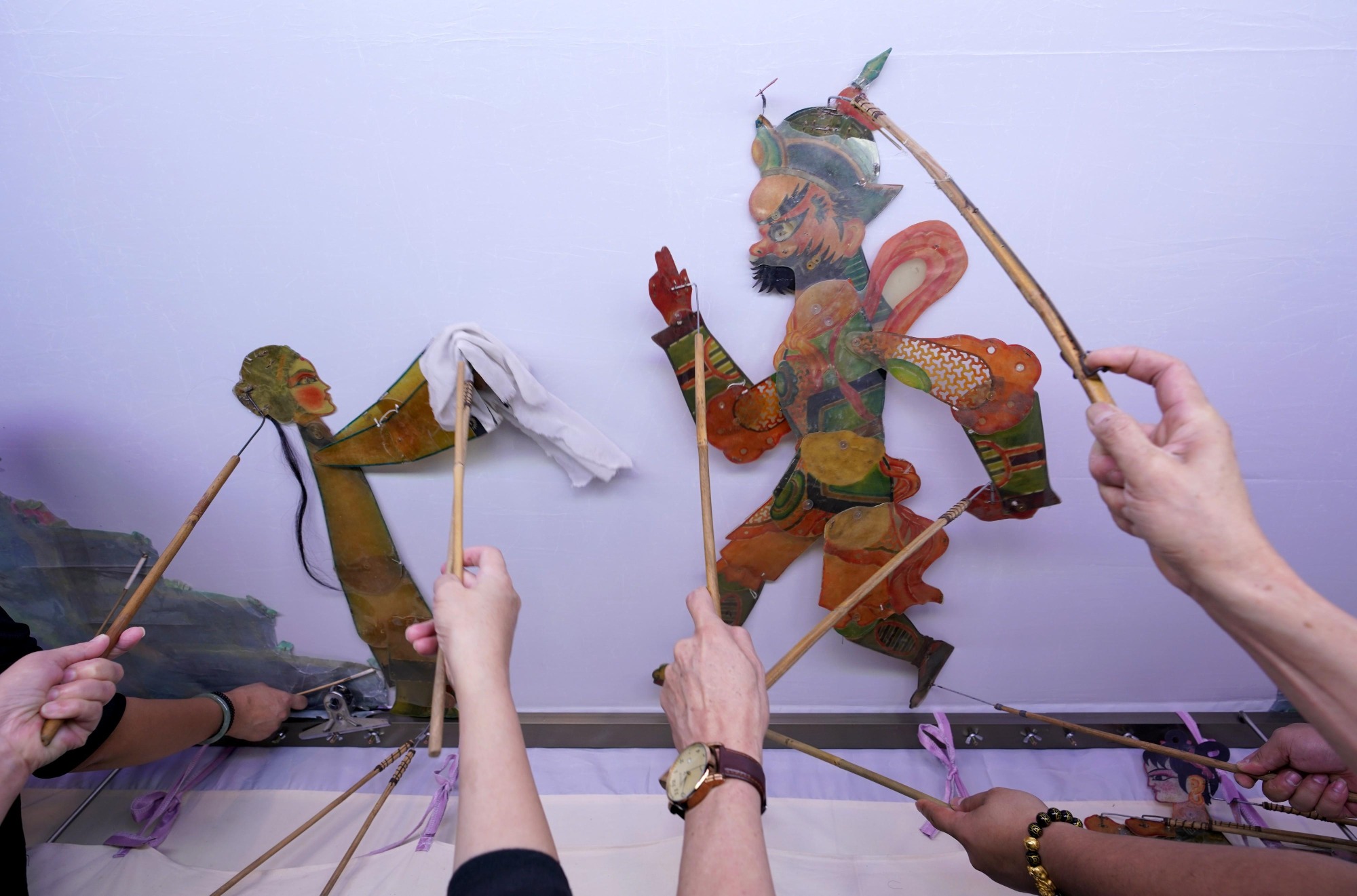 皮影戲所展示的影偶和影景,大多以牛皮製作。影偶輪廓分明,手腳活動自如,動作靈活優美。原來要操作一隻皮影偶,需要2個人合作,1人控制上身,1人操作下半身,才能讓影偶呈現出飛、舞、走、跳等活潑細膩的姿態,殊不簡單。
