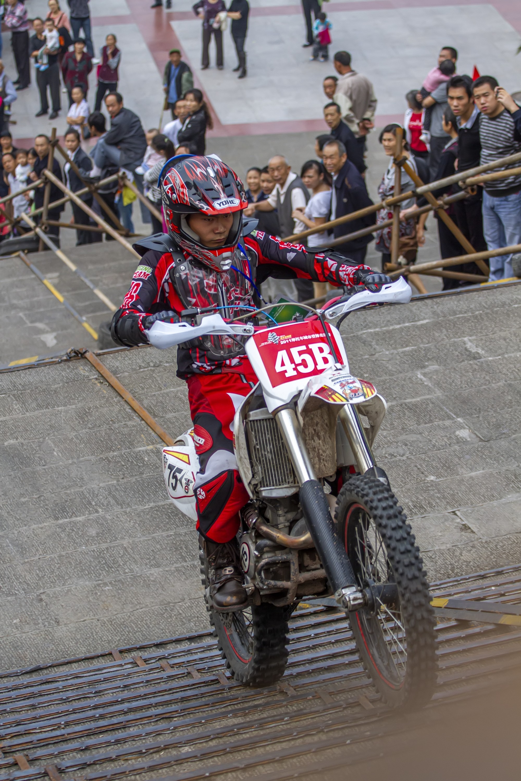 2011年,張雪參加重慶雲陽摩托車城市登梯競技賽,他在比賽中專注奮力爬坡。
