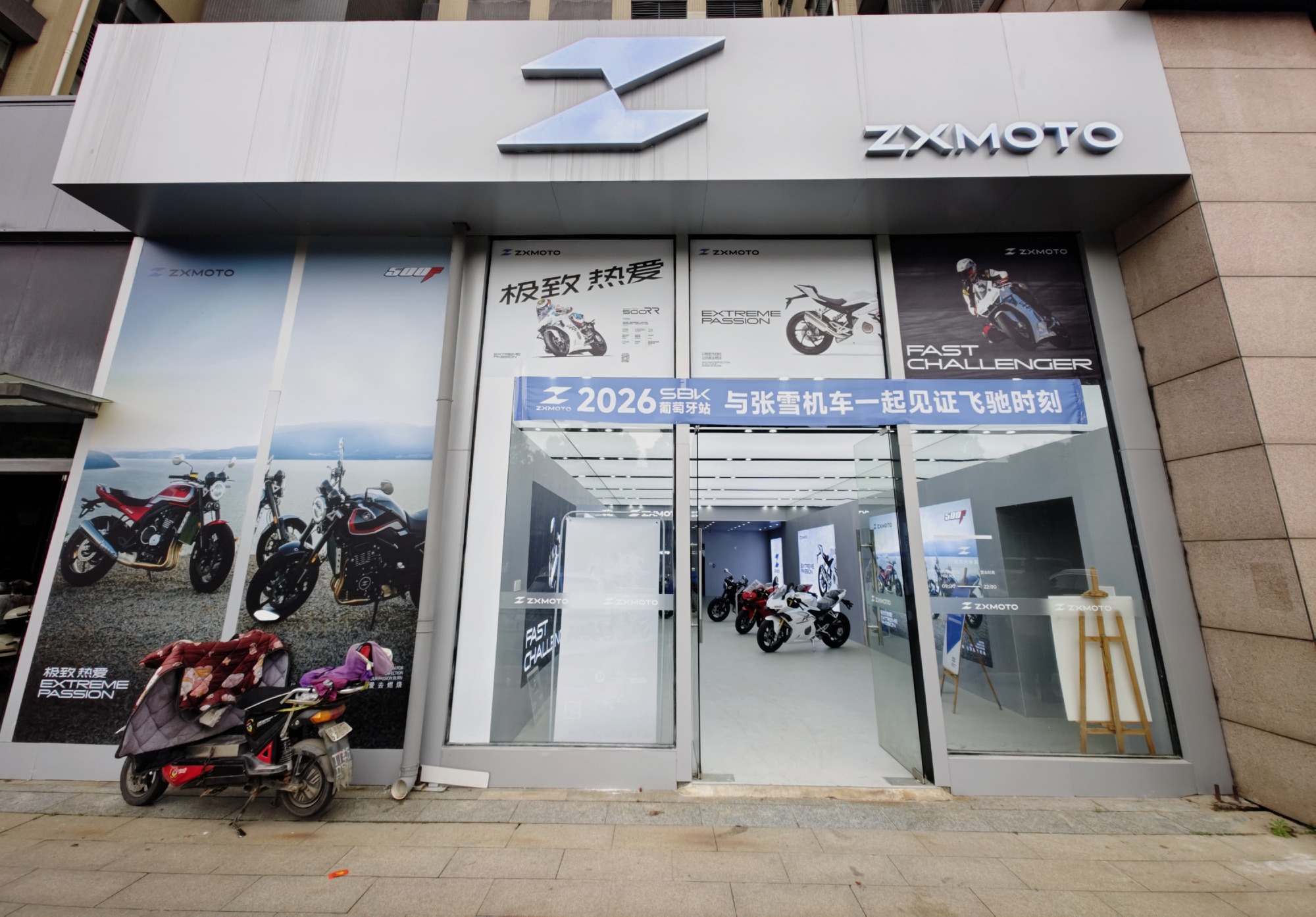 張雪機車武漢店,店前掛着「與張雪機車一起見證飛馳時刻」的藍色橫幅。
