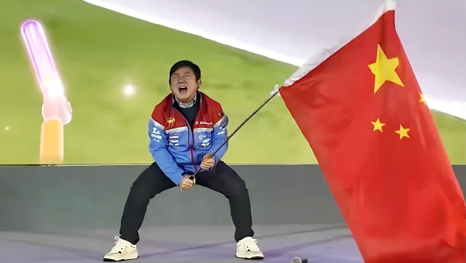 張雪見證張雪機車贏得世界超級電單車錦標賽葡萄牙站冠軍,激動地揮舞着手中的國旗。