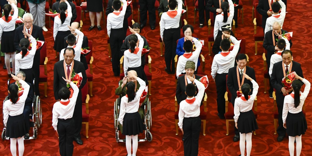 頒授儀式在人民大會堂金色大廳舉行,少先隊員首先向「七一勳章」獲得者獻花和敬禮,之後習近平逐一為獲得者頒授勳章。