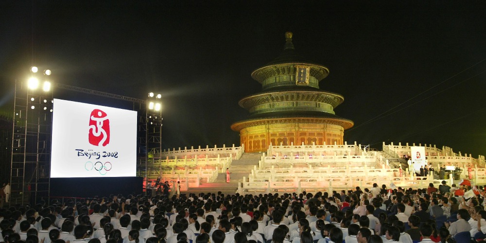 2003年8月3日,中國在首都北京的天壇祈年殿前,隆重舉行了第29屆奧林匹克運動會會徽全球發布儀式。時任中共中央政治局常委、全國人大常委會委員長吳邦國與第29屆奧運會協調委員會主席維爾布魯根(Hein Verbruggen)一起為北京奧運會會徽揭幕。