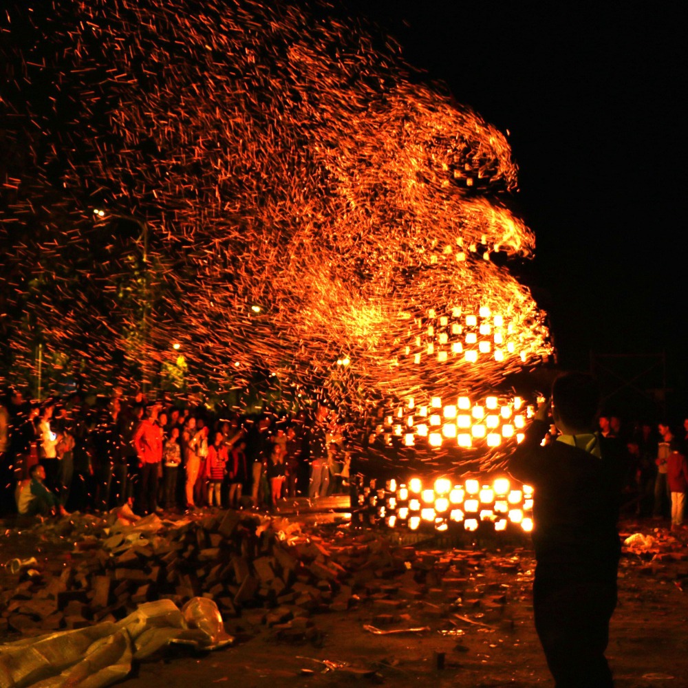 到了八月十五,待月上中天,隨着鞭炮響聲,全村齊聚塔前。祭月之後,主燒人將柴火塞入塔內,待塔身燒得通紅,再撒上松香粉,引焰助威,火焰從數百個塔眼中噴發而出,火星漫天飛舞,映紅半邊夜空,場面極為壯觀。