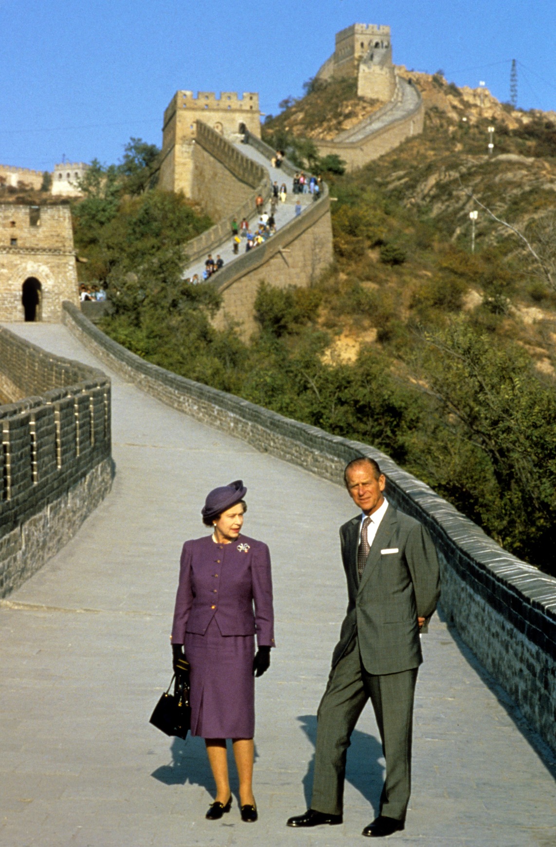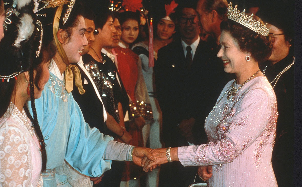 女皇和丈夫菲臘親王在北京參觀長城和故宮,又看了京劇演出,後與演員握手。一般來說,女皇與民眾握手時要戴手套,但照片中她並沒有戴着手套,顯示很親民。