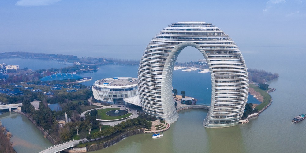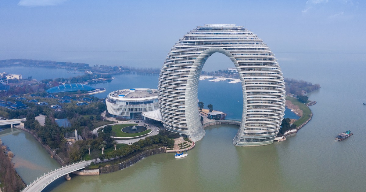 位處太湖之濱的「月亮酒店」充分利用了濱水優勢。酒店環形的建築體和水中的倒影相連,營造出一種真實和幻象交接的超現實美景,完美地將建築與自然融為一體。