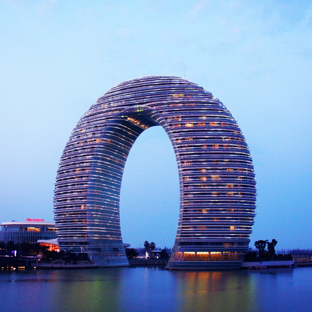 中國湖州喜來登溫泉度假酒店又有「月亮酒店」之稱,由上海飛洲集團投資約15億元建設,是國內首家水上白金七星級酒店!「月亮酒店」外型獨特,呈一個指環形屹立於太湖之上,形狀可以說是國際首創、中國唯一,絕對稱得上是一座世界級的建築鉅作!「月亮酒店」自建成以來,已成為長三角腹地、太湖沿岸的地標性建築,與150公里外的上海「東方明珠」遙相呼應,媲美阿聯酋杜拜的「帆船酒店」。