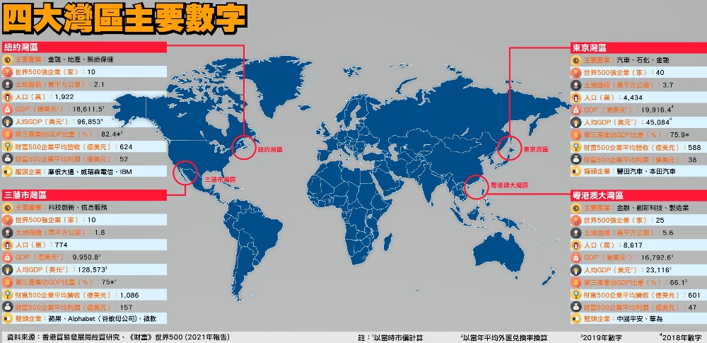 一年將終,又是企業派發成績單的時候了。《財富》世界500強排行榜出爐,顯示全球四大灣區的成績。大家對四大灣區認識有多少?本文嘗試把各灣區主要經濟數字列出來,當中看到灣區之間的變化,也看到疫情下所面臨的挑戰。