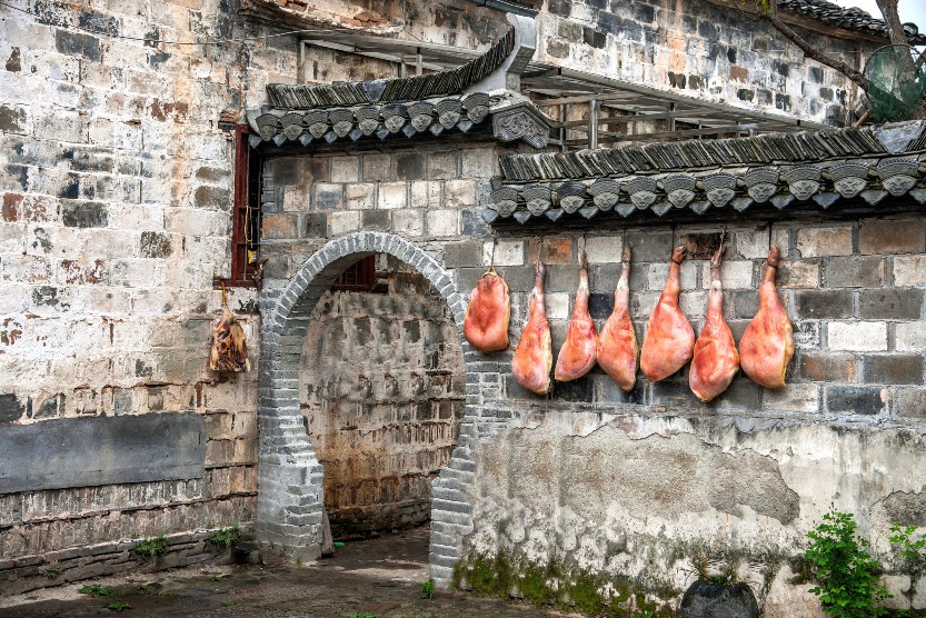 每年春節,都是徽州人「殺年豬」、醃製火腿的時候,一條條掛在墻上風乾的火腿,也成為了安徽古鎮的獨特風景線。
