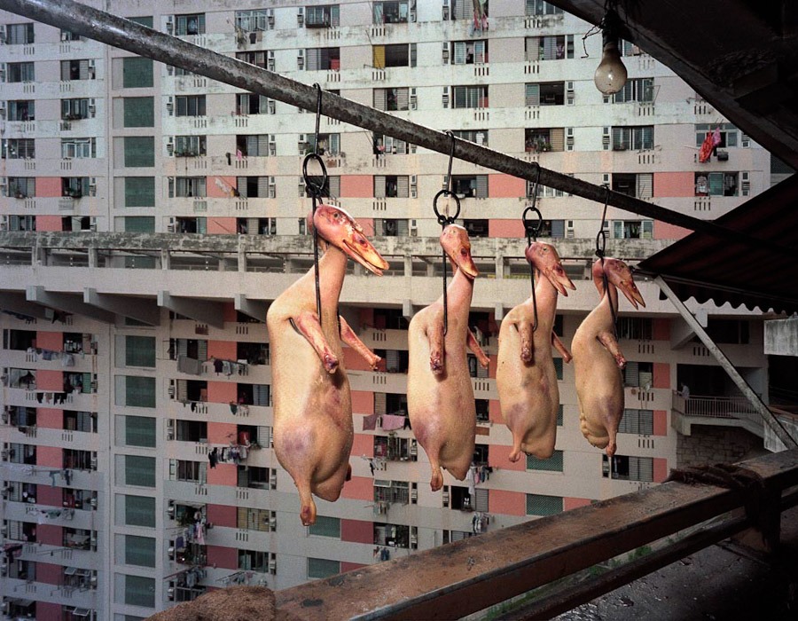 有攝影師在香港一座公共屋邨裏,拍攝到晾鴨子的畫面,一隻隻透亮色澤的鴨子被綁在晾衣竿上,等待風乾。原來這是製作燒鴨的工序之一:在鴨腹裏填進醃料,以滾水淋過數遍後,將鴨子吊掛起來,晾乾水分,才能進行烤製。